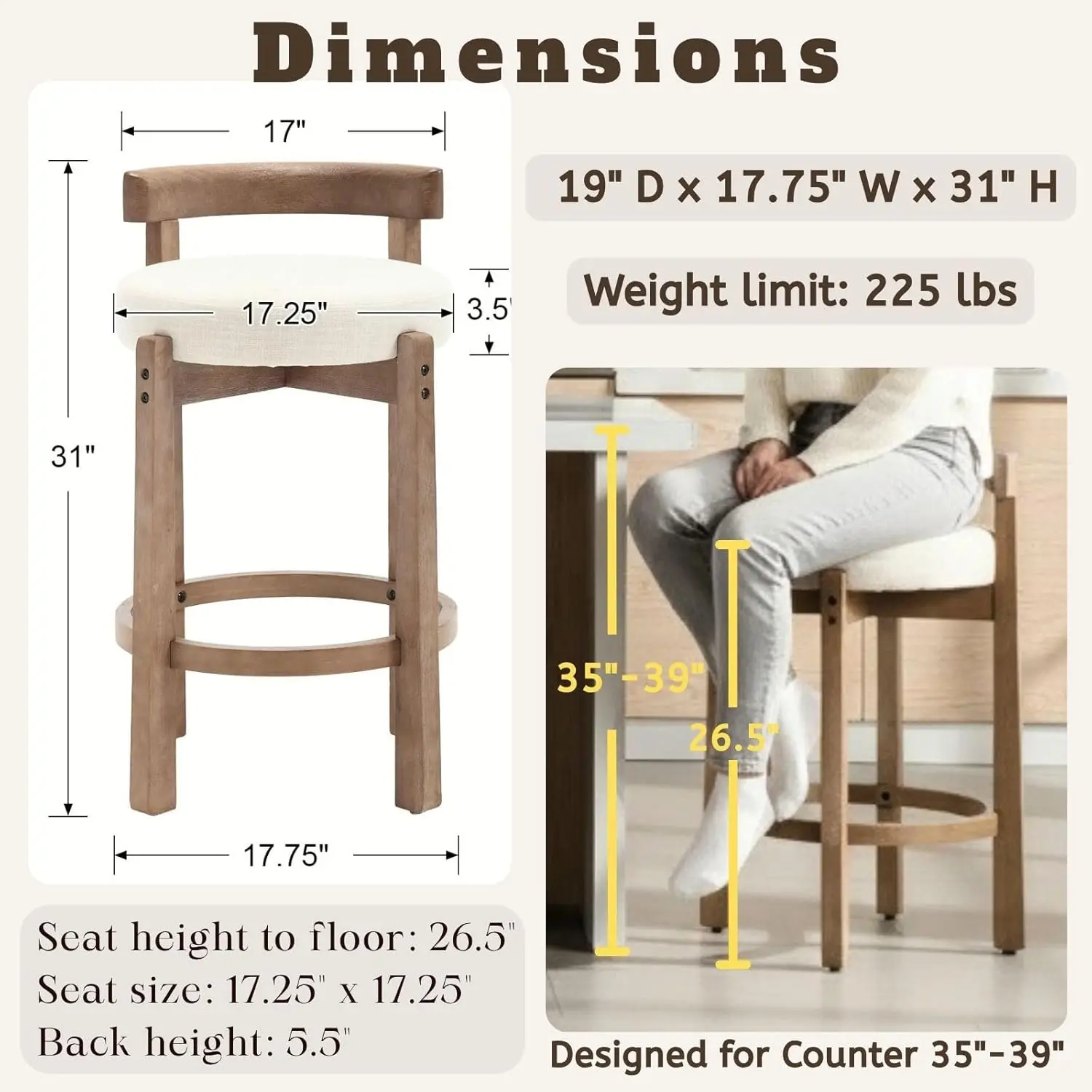 【Dimension】: Overall size: 19" D x 17.75" W x 31" H. Seat height to floor: 26.5". Seat size: 17.25" D x 17.25" W x 3.5" Thickness Back Height: 5.5". Weight Limit: 225 lbs