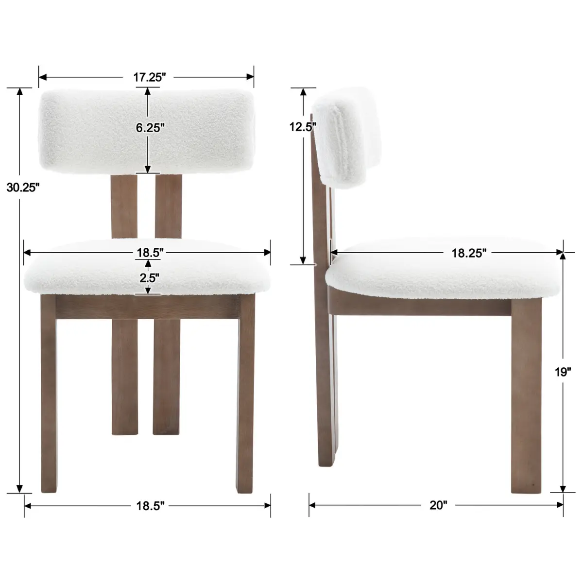 [Overall size] 18.5”Wx20”Dx30.25”H. Seat size: 18.5”W x 18.25”D. Seat height: 19”H. Backrest length: 12.5”H. Weight capacity: 300 lbs.