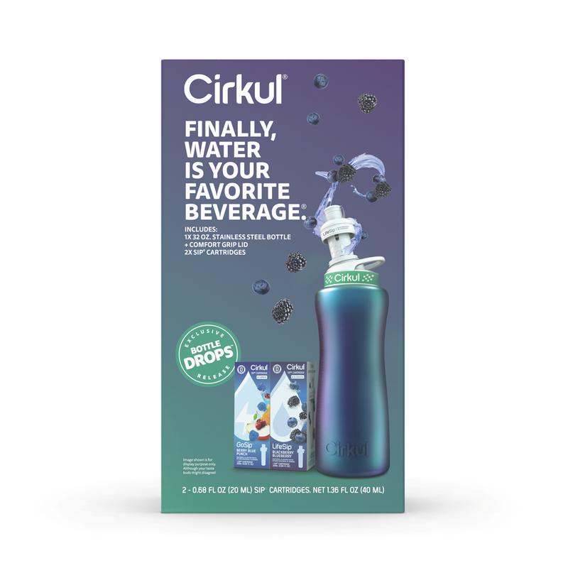 Ready to elevate your water game? This 32oz. Chameleon Stainless Steel Bottle Starter Kit is your perfect introduction to Cirkul. It includes an innovative water bottle and 2 flavor cartridges: LifeSip Blackberry Blueberry and GoSip Berry Blue Punch. No sugar, zero calories, and no artificial colors. Enjoy personalized, delicious hydration!