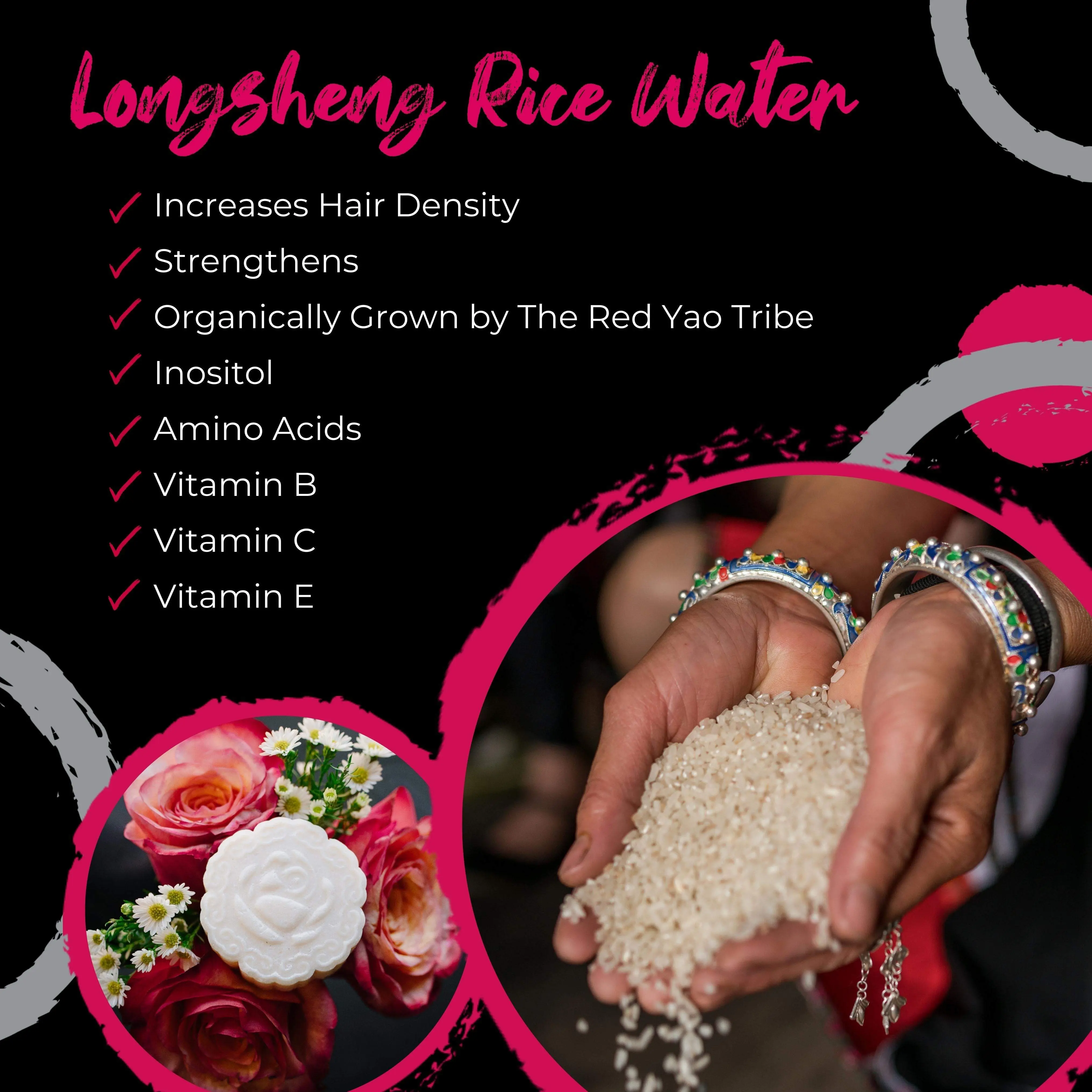 Longsheng Rice: renews, rejuvenates, repairs. Cocoa Butter: conditions, softens, moisturizes. Shea Butter: conditions, moisturizes. Rice Bran Oil & Hydrolyzed Rice Protein: increases volume and shine, strengthens. Aloe Vera: renews, rejuvenates, repairs, conditions, smooths, increases shine. Bamboo: renews, rejuvenates, repairs, conditions, smooths, increases shine.