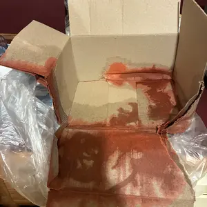 My box was red all over when it arrived, my mail man but box in a trash bag and told me to check it, I waited all this time to get 2 rotten pickles and a bloody red box