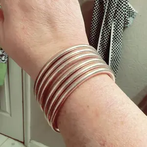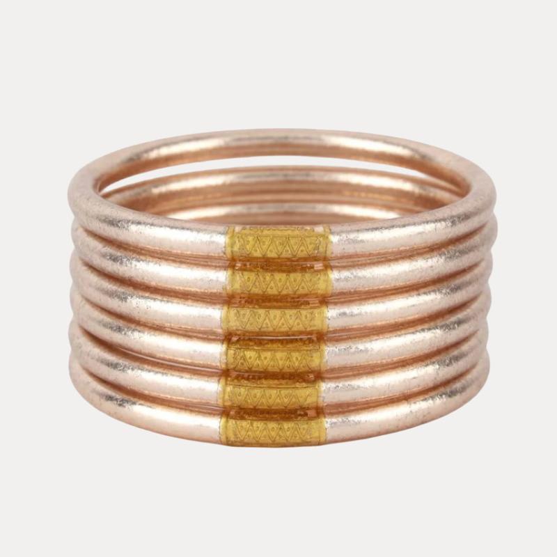 Fabulously festive and glamorous BuDhaGirl Champagne All Weather Bangles® (AWB®), are the epitome of luxury in BuDhaGirl's impressive lifestyle collection. Our remarkable bangles redefine elegance with their weightless, soundless, waterproof, and TSA-proof design. Crafted to perfection, each set comprises six bangles, symbolizing intentions for the day. Wear them anywhere, as their soundless and waterproof nature ensures seamless integration into any setting.