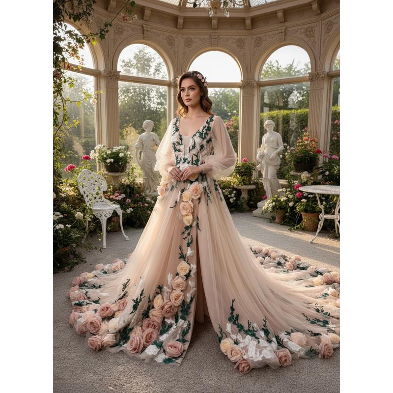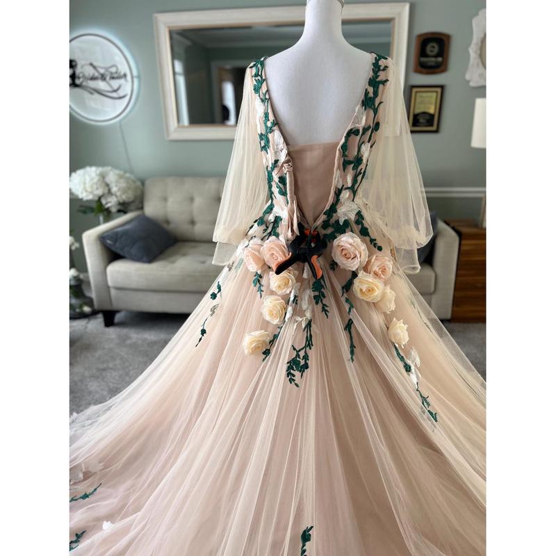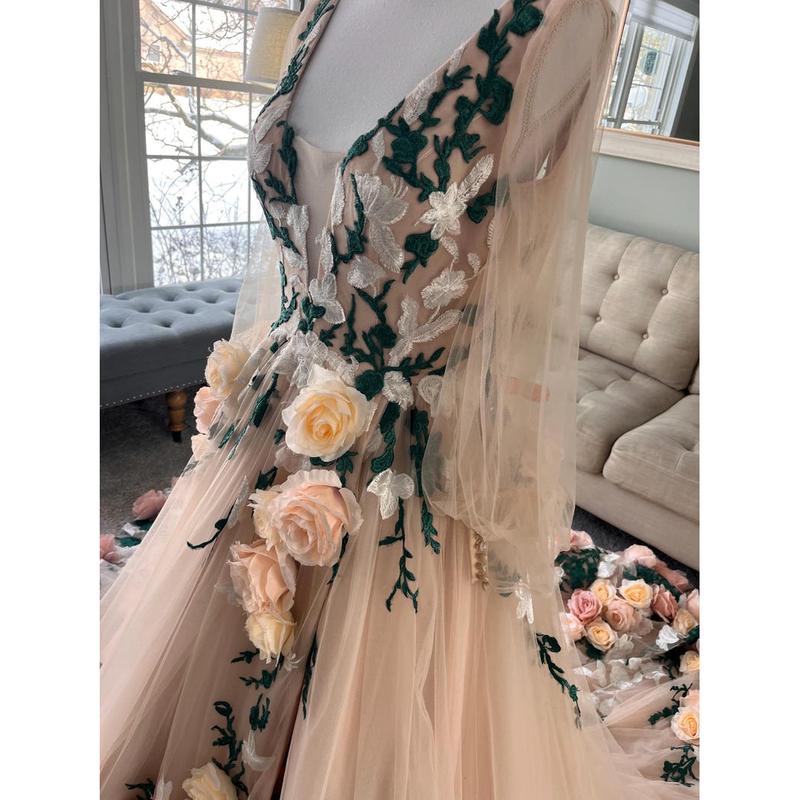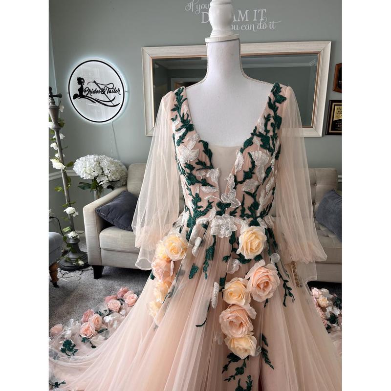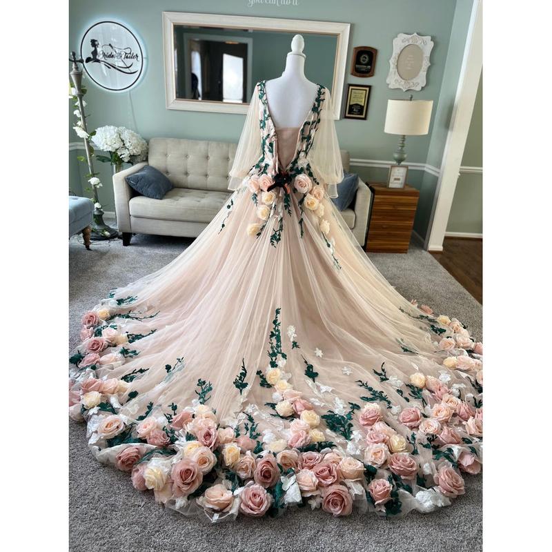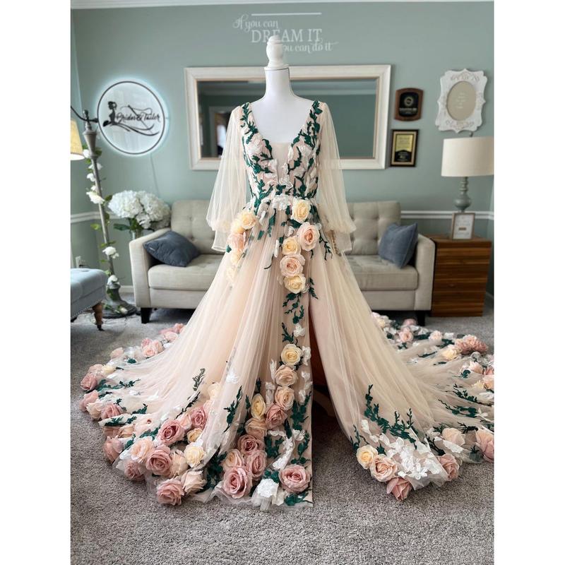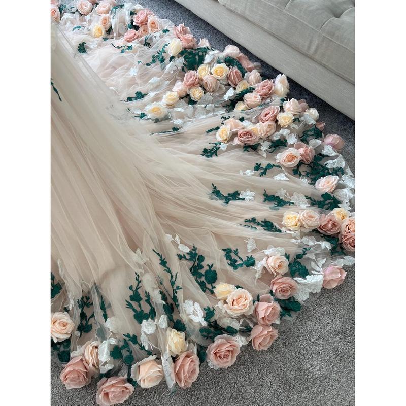 Courtney Champagne Wedding Dress with 3D Flowers, Garden Themed Wedding Dress, Custom 3D floral wedding dress, Custom Floral Gown