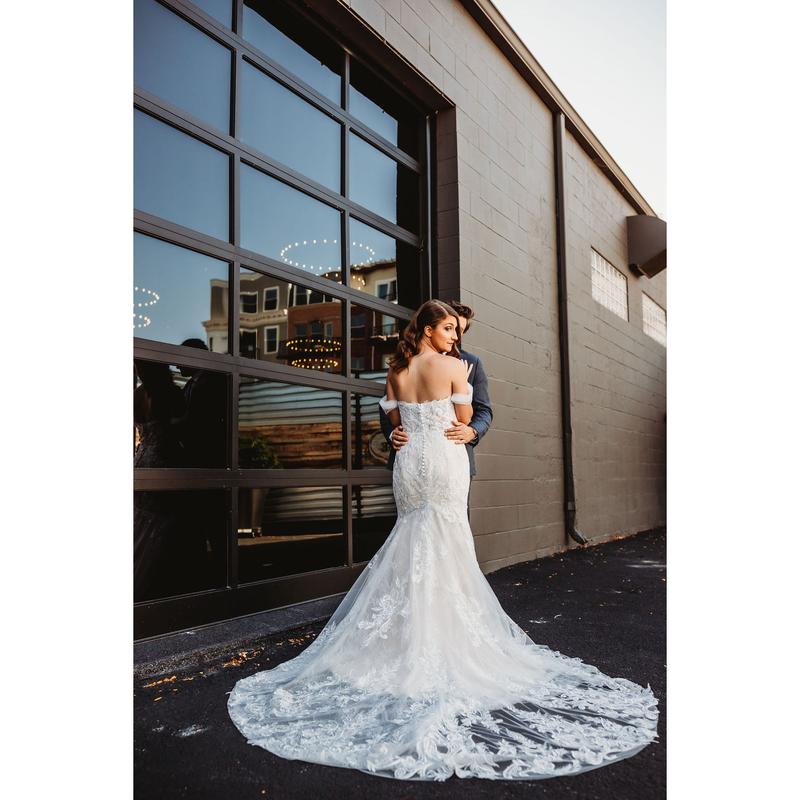 This custom off-the-shoulder mermaid wedding dress is perfect for the bride who loves plenty of lace detailing. It consists of two tones- Light Champagne and an ivory lace overlay. It also has a layer of elegant Chantilly lace below the outer layer for more dimension. The train of the dress is in Chapel length but can be created in any other length. The off shoulder sleeves make it whimsical and suitable for outdoor/indoor weddings.