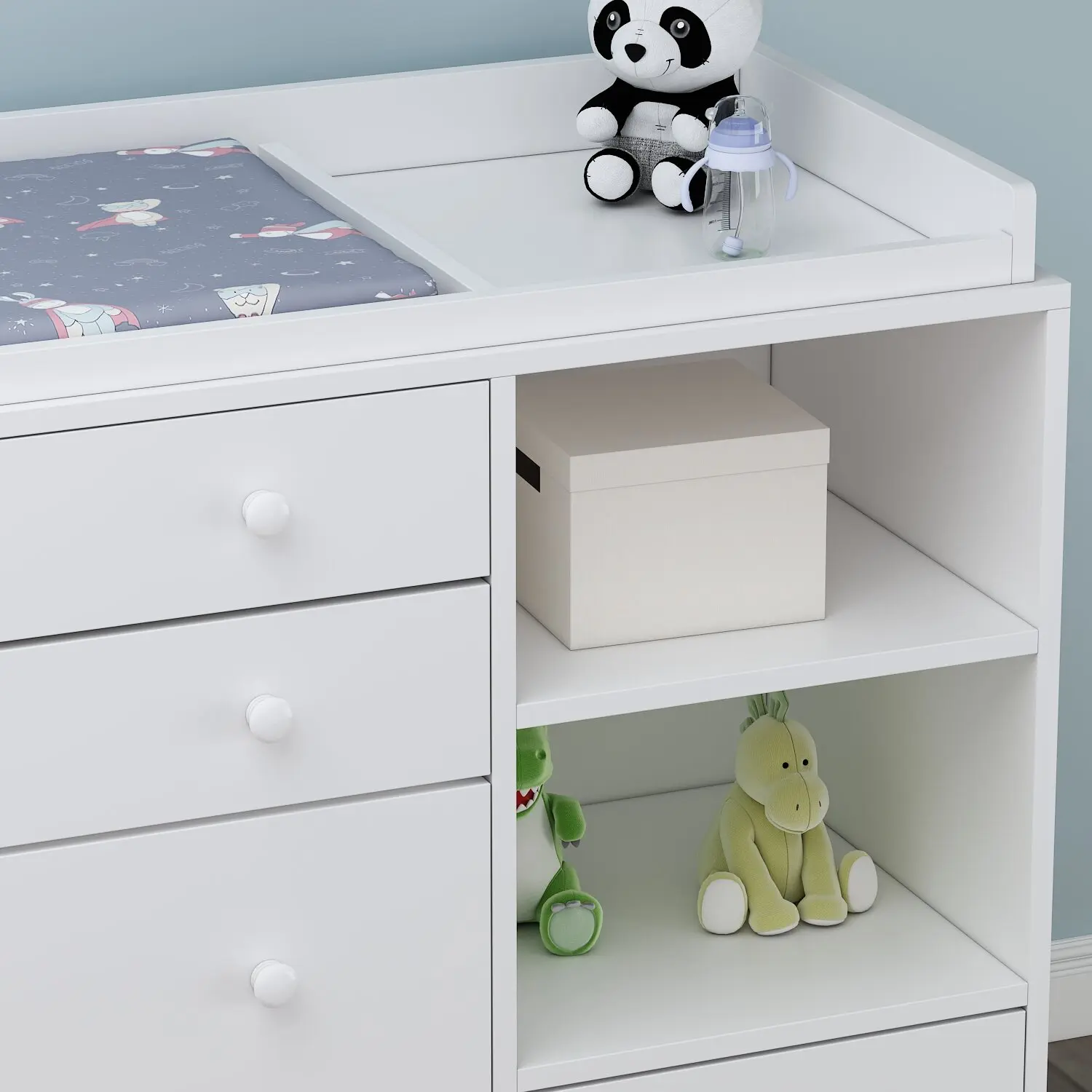 súper práctico y moderno Tiene cajones amplios y espacios laterales perfectos para tener todo organizado y a la mano de una muy buena calidad Además es resistente y luego puedes usarlo como cómoda. ¡Funcional y hermoso!