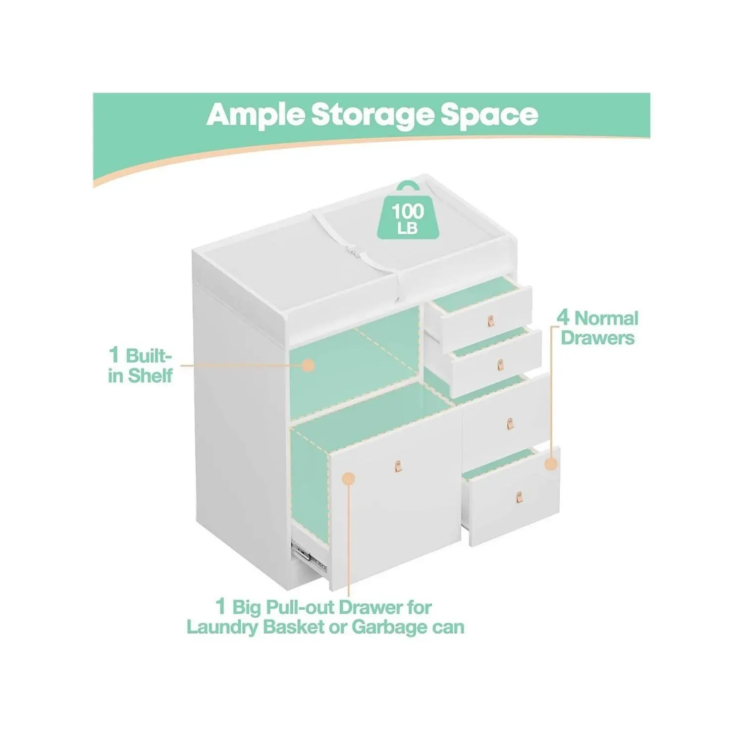 【FUNCTIONAL & SPACIOUS STORAGE SPACE】This changing dresser has large area at the top for changing diapers and it holds up to 100LB. You can put normally used tissue, butt cream in the built-in shelf. There also are 4 drawers which can be used to store baby clothes, towels, toys, etc. The biggest pull-out drawer is such convenient to put a laundry basket (Under 7 GALLON) that is perfect for throwing dirty clothes or used urine pads..