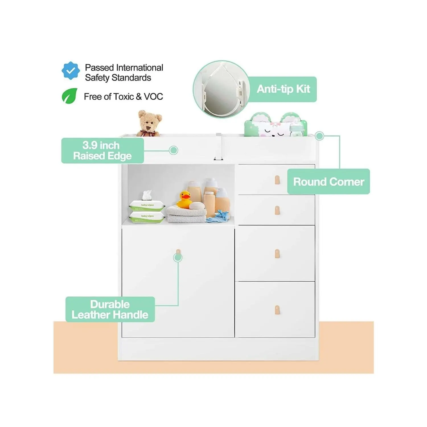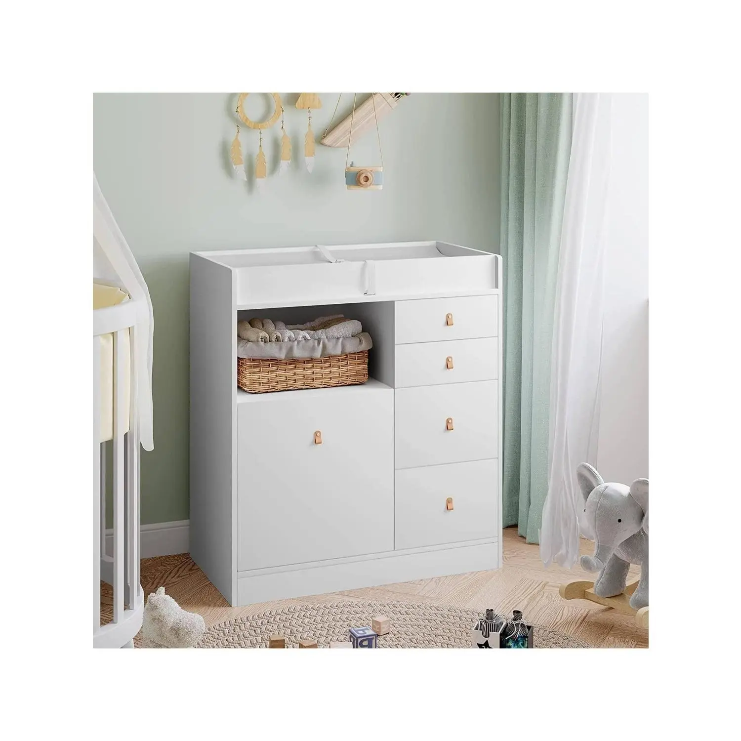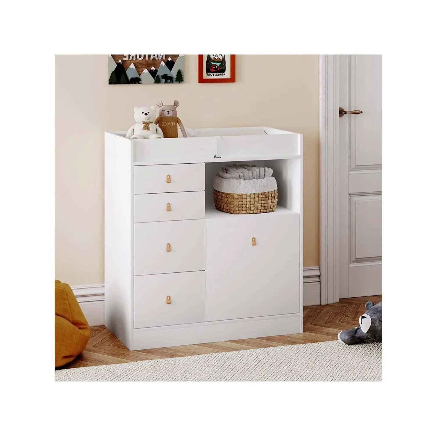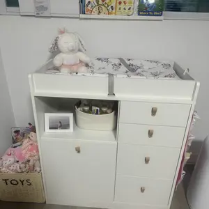 【SAFE & SECURITY】Tested by professional institutions,our changing table meets and exceeds safety standards.Our babies daycare chest dresser has round corners and raised fences of four sides, as sell as a waterproof soft changing pad with a safety belt to prevent the baby from rolling over and falling. All drawers are equipped with leather handles to avoid children from bumping and hurting. 【SIMPLE & UNIVERSAL DESIGN】The white nursery dresser has a simple and stylish appearanceand it goes well with most home decoration styles.When your baby grow up and don't need to change diapers any more, it can be used as a common dresserand storage cabinet in the living room or bedroom without being idle.