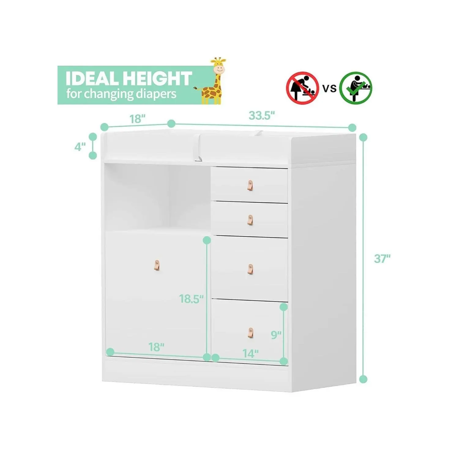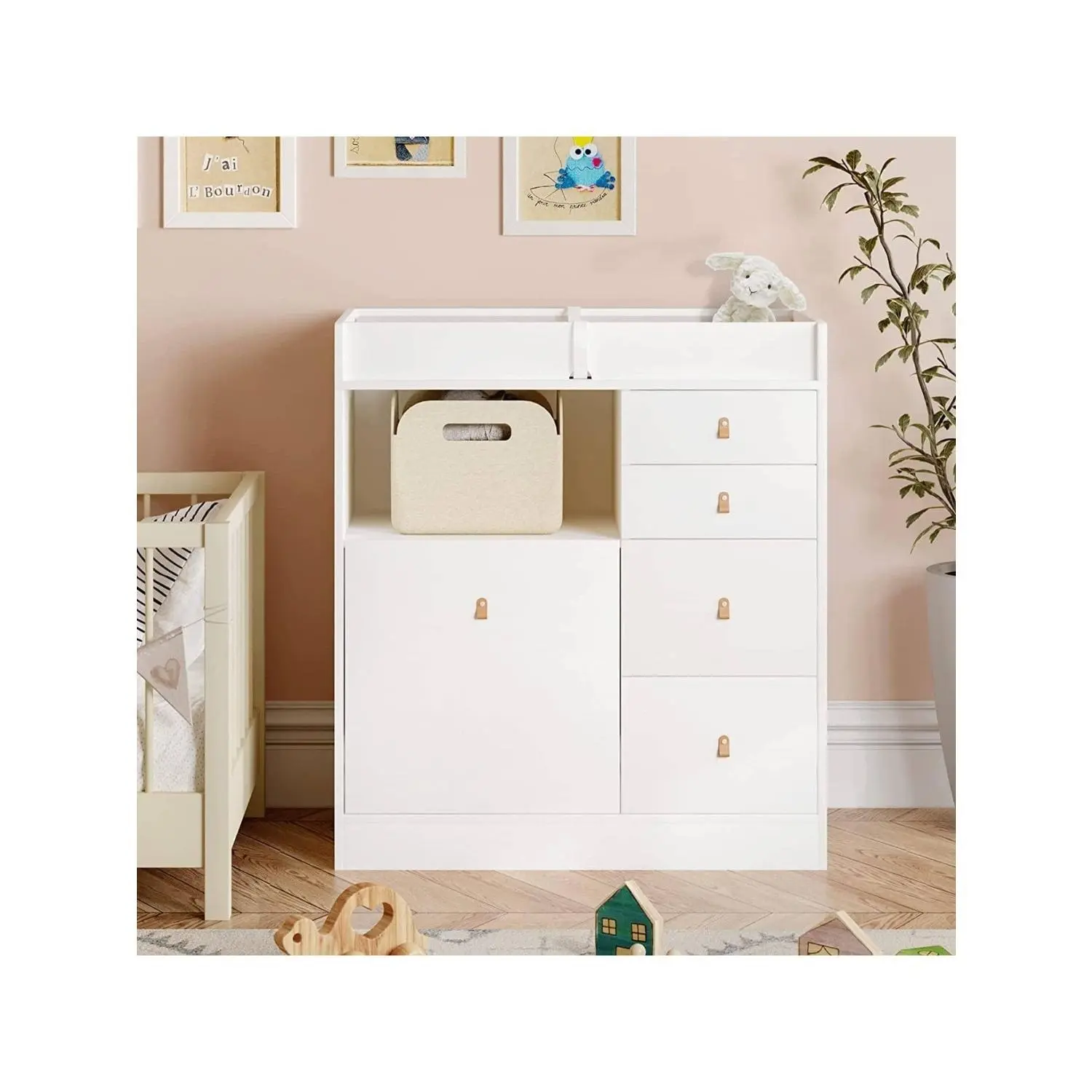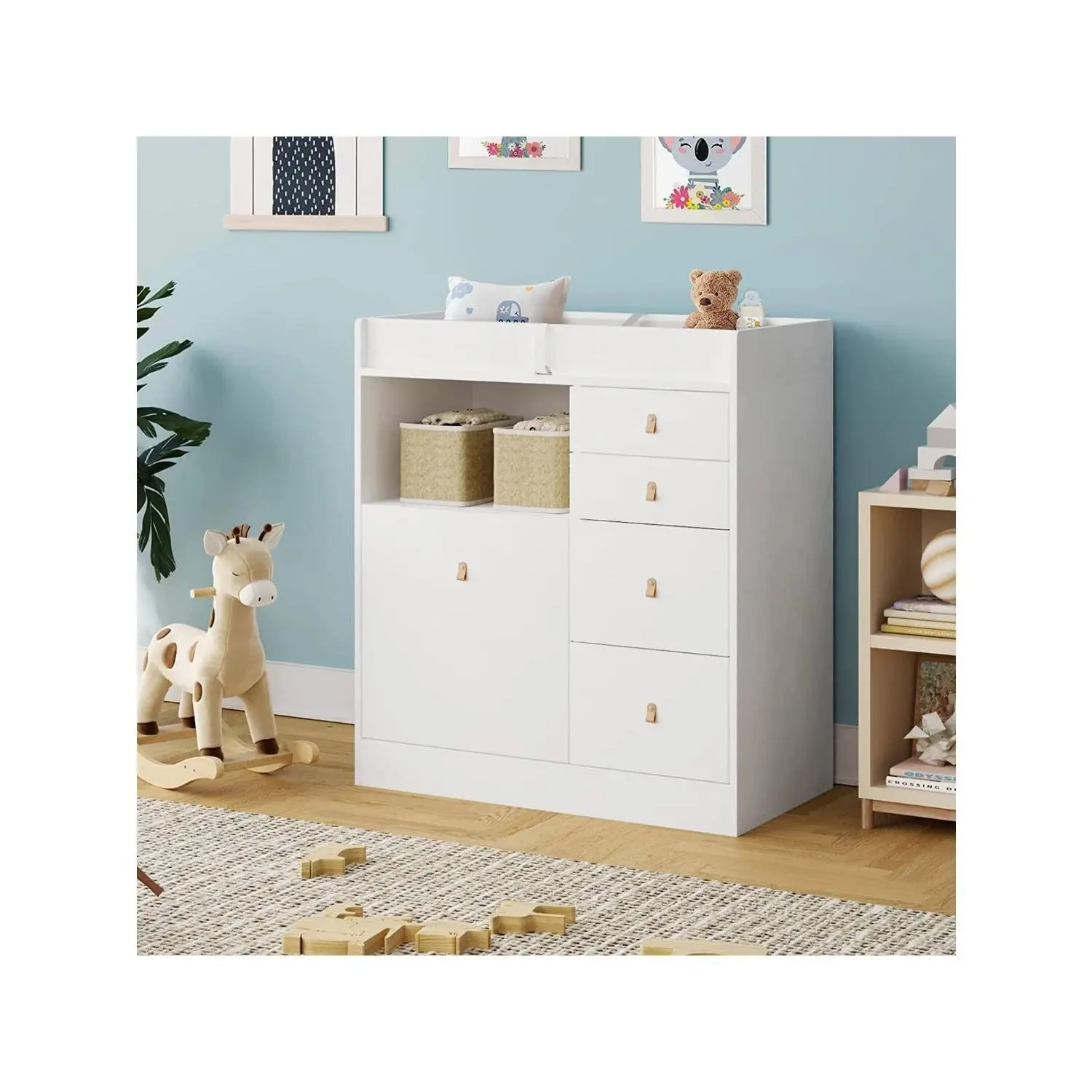 【SAFE & SECURITY】Tested by professional institutions,our changing table meets and exceeds safety standards.Our babies daycare chest dresser has round corners and raised fences of four sides, as sell as a waterproof soft changing pad with a safety belt to prevent the baby from rolling over and falling. All drawers are equipped with leather handles to avoid children from bumping and hurting. 【SIMPLE & UNIVERSAL DESIGN】The white nursery dresser has a simple and stylish appearanceand it goes well with most home decoration styles.When your baby grow up and don't need to change diapers any more, it can be used as a common dresserand storage cabinet in the living room or bedroom without being idle.