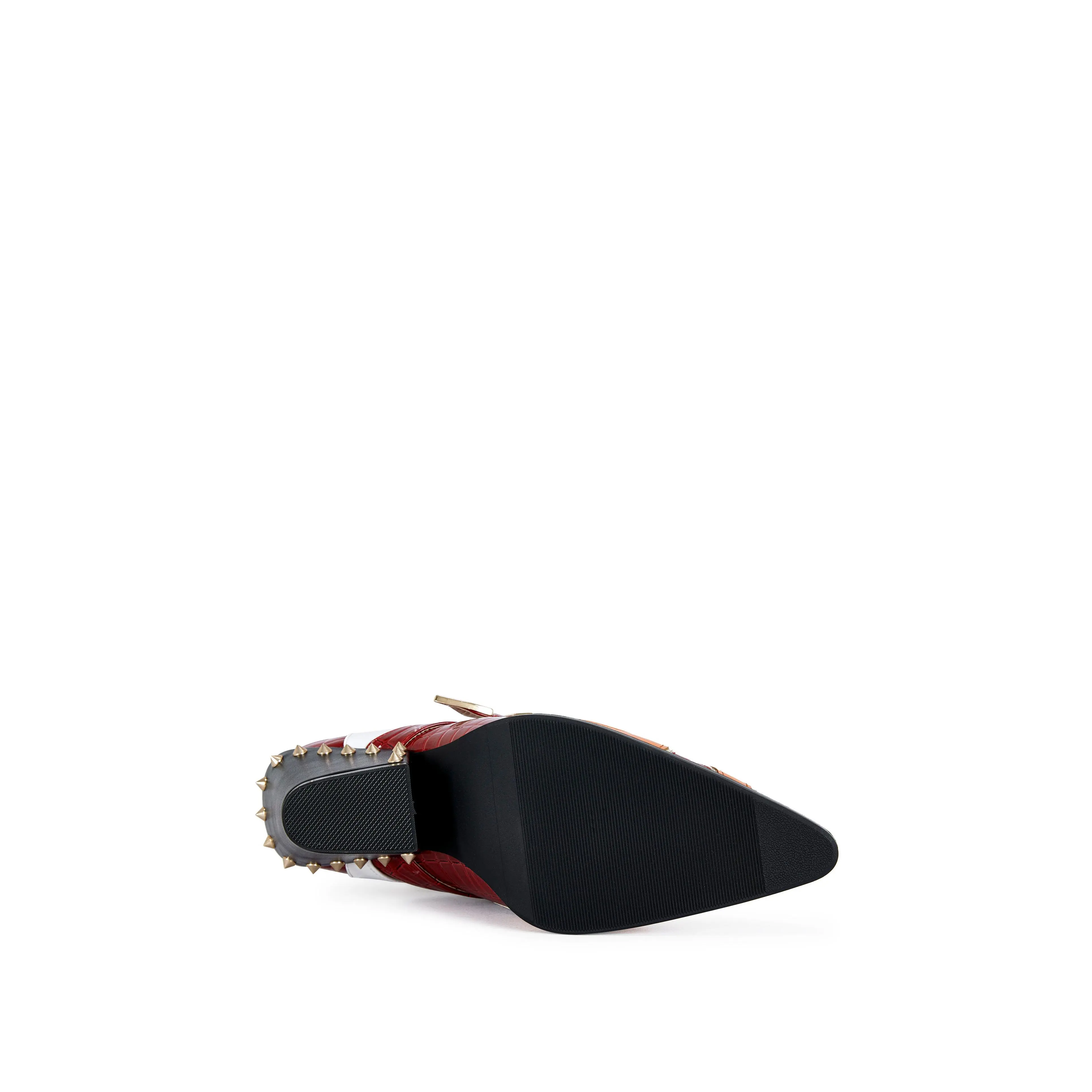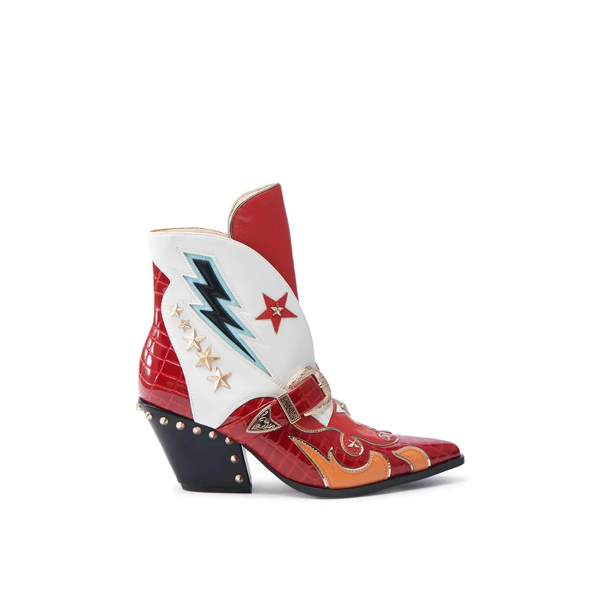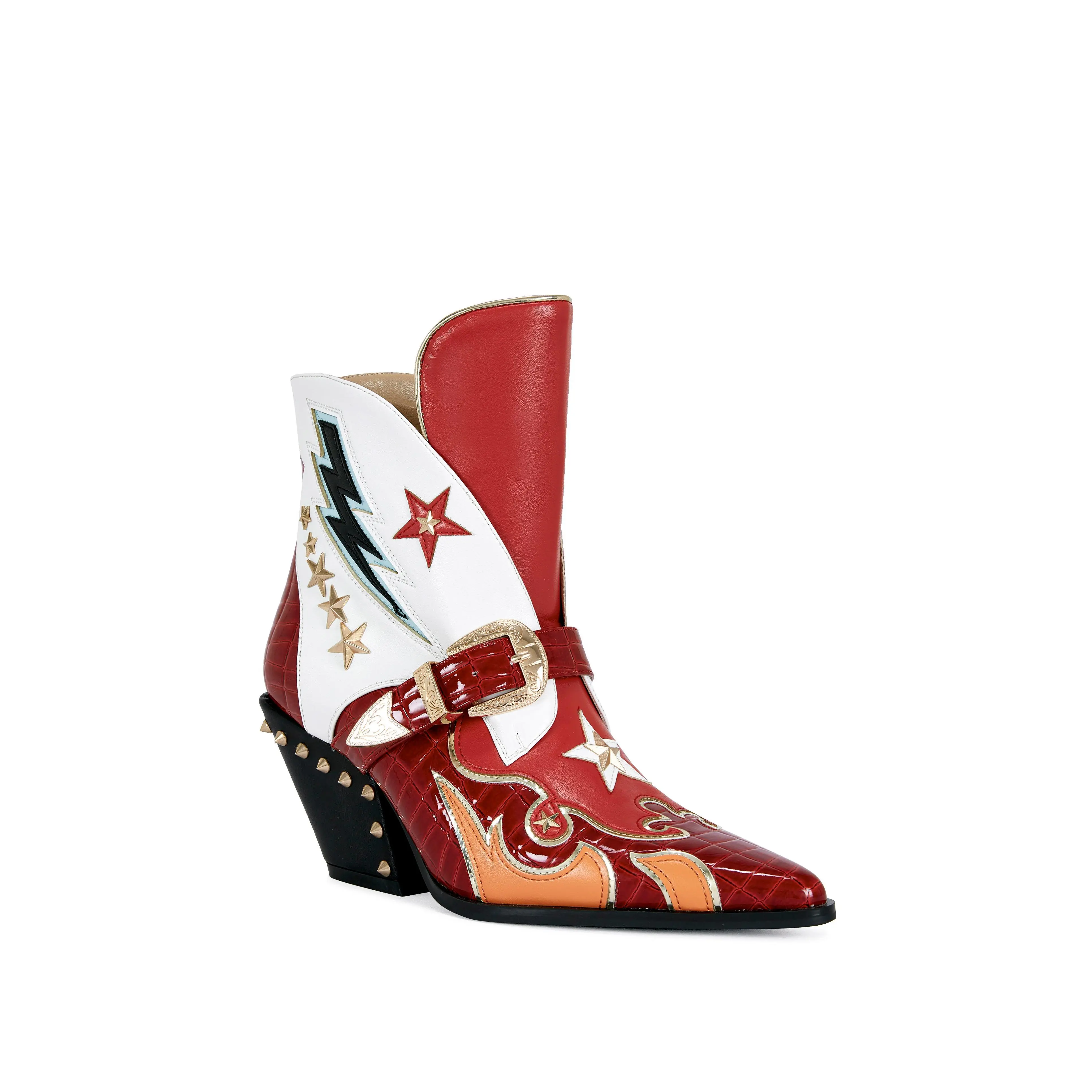 The CHANNING western bootie is a statement piece that will elevate any outfit with its bold red and white faux leather design. Featuring lightning and star accents, these ankle booties add a level of fun to any look that it gets paired with. The studded block heel adds an extra eye-catching accent to these bold statement booties.Heel Height: 2.75" Shaft Height: 5" Calf Opening: 4.5"