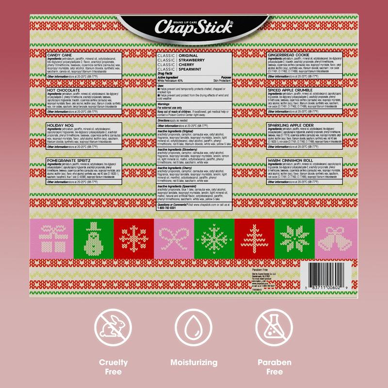 Celebrate the holiday season with the ChapStick Cozy Countdown Advent Calendar. Featuring a cheerful, cozy sweater–inspired design, this limited-edition set includes 12 lip balms—four classic favorites and eight seasonal flavors. Each balm delivers smooth, soothing moisture to keep lips soft and comfortable all year long.
