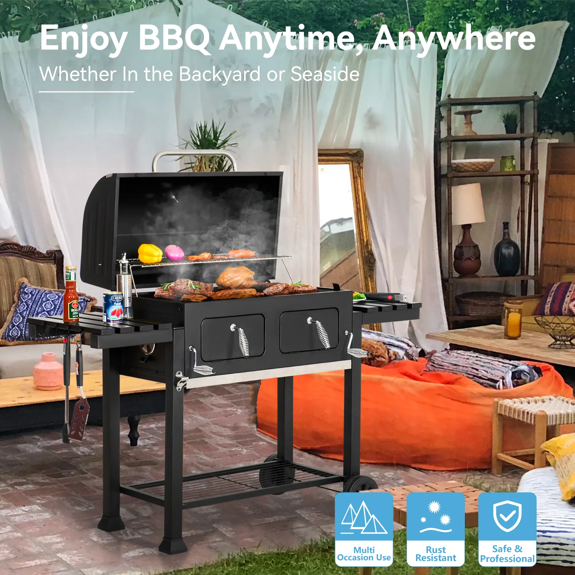 ·Durable Construction: The enamel process used in the grill ensures that the grilling grates and charcoal trays are resistant to high temperatures and easy to clean.