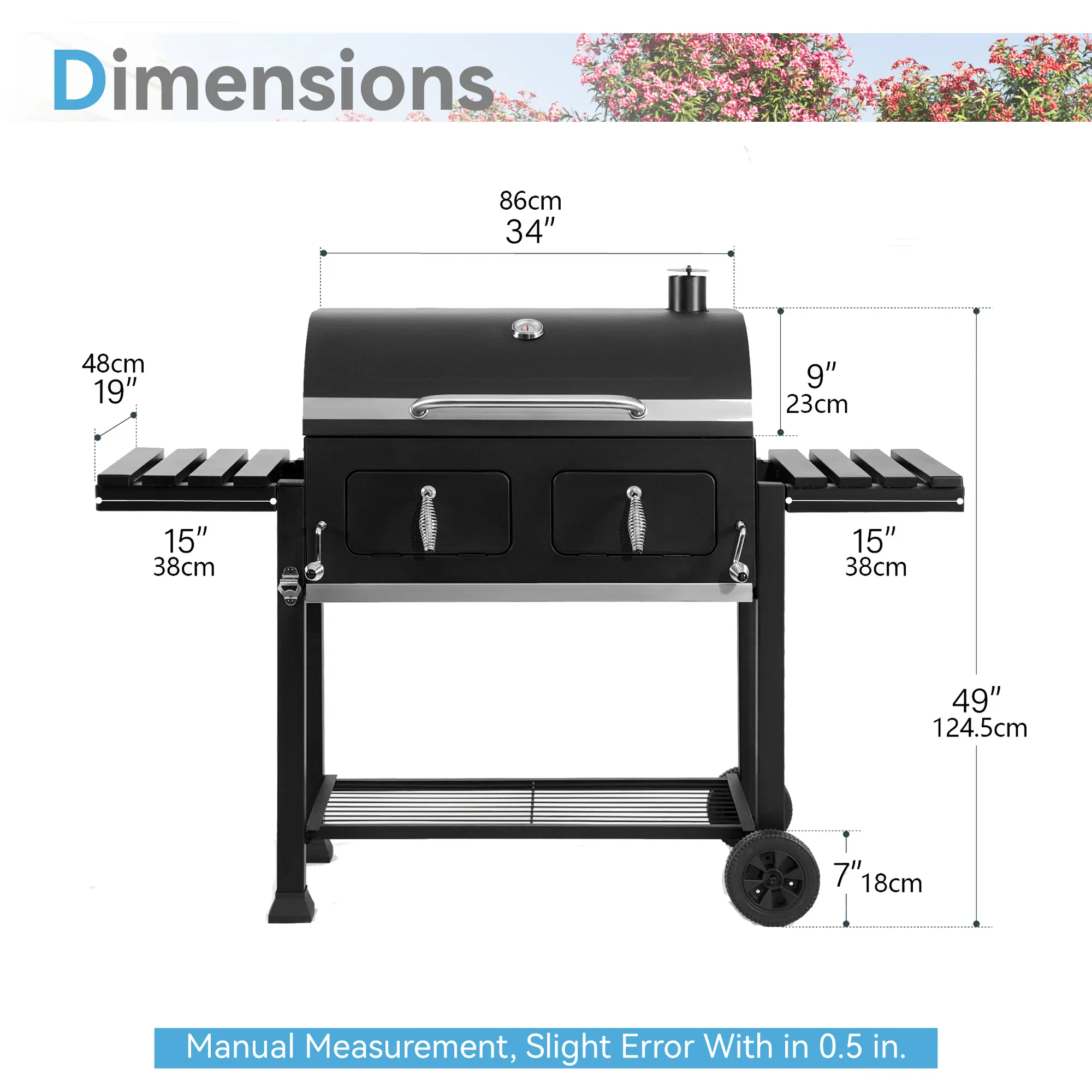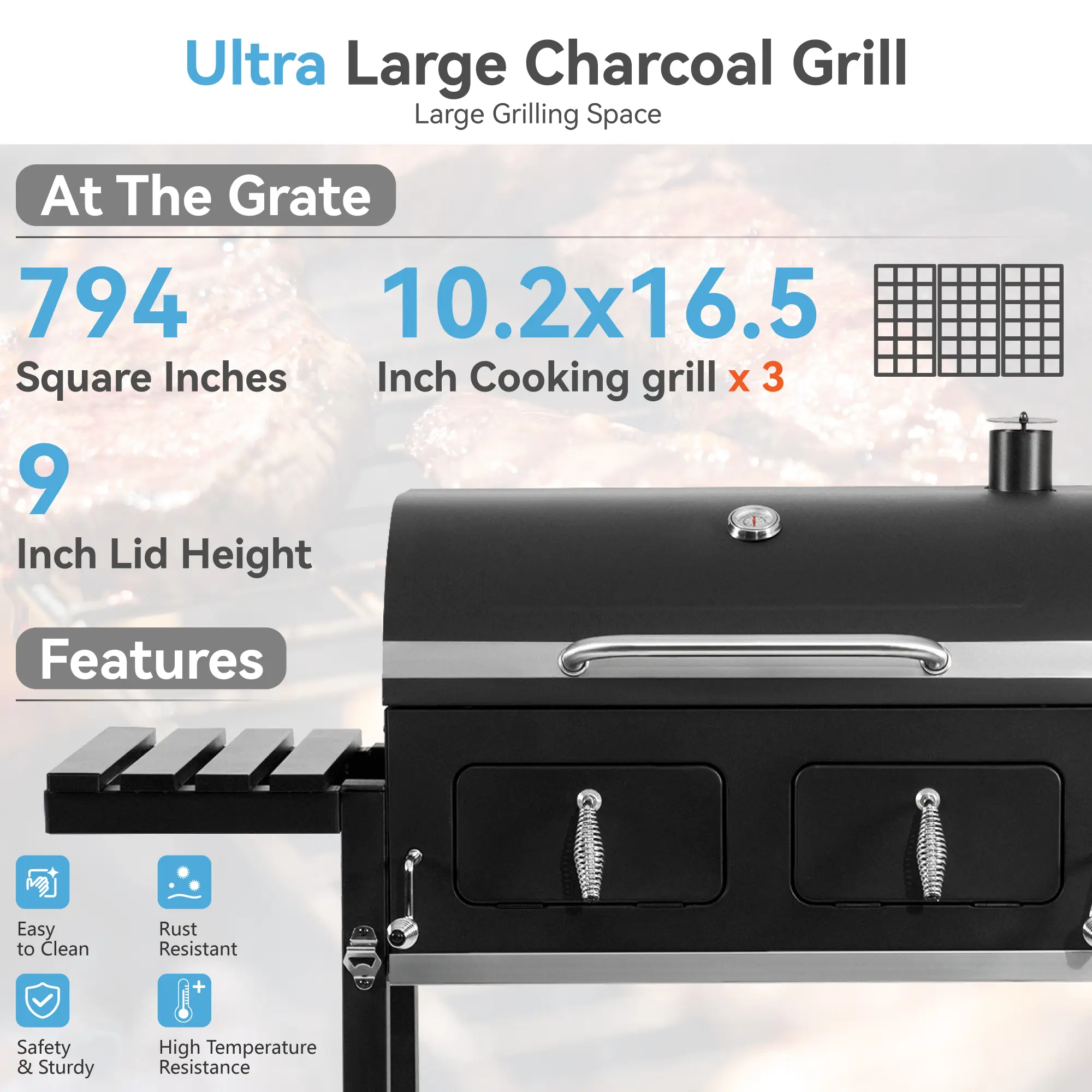 ·Charcoal Tray and Lifting Handle: The grill includes a lifting handle on both the left and right side, allowing you to adjust the charcoal tray to achieve the desired heat level. This feature ensures efficient and effective cooking.