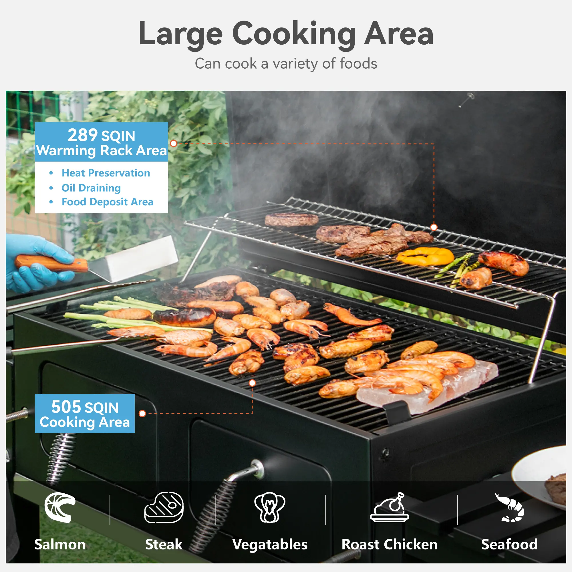 ·Spacious Cooking Area: The 794 sq. in. cooking area includes 505 sq. in. porcelain-enameled iron cooking grates and 289 sq. in. warming rack, allowing for a variety of cooking options.