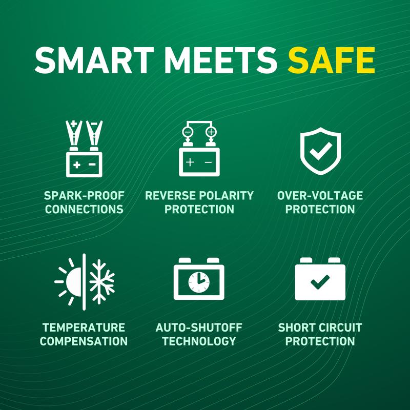 Multiple built-in safety features, including spark-proof connections, reverse polarity protection, and temperature compensation, provide peace of mind during every use.