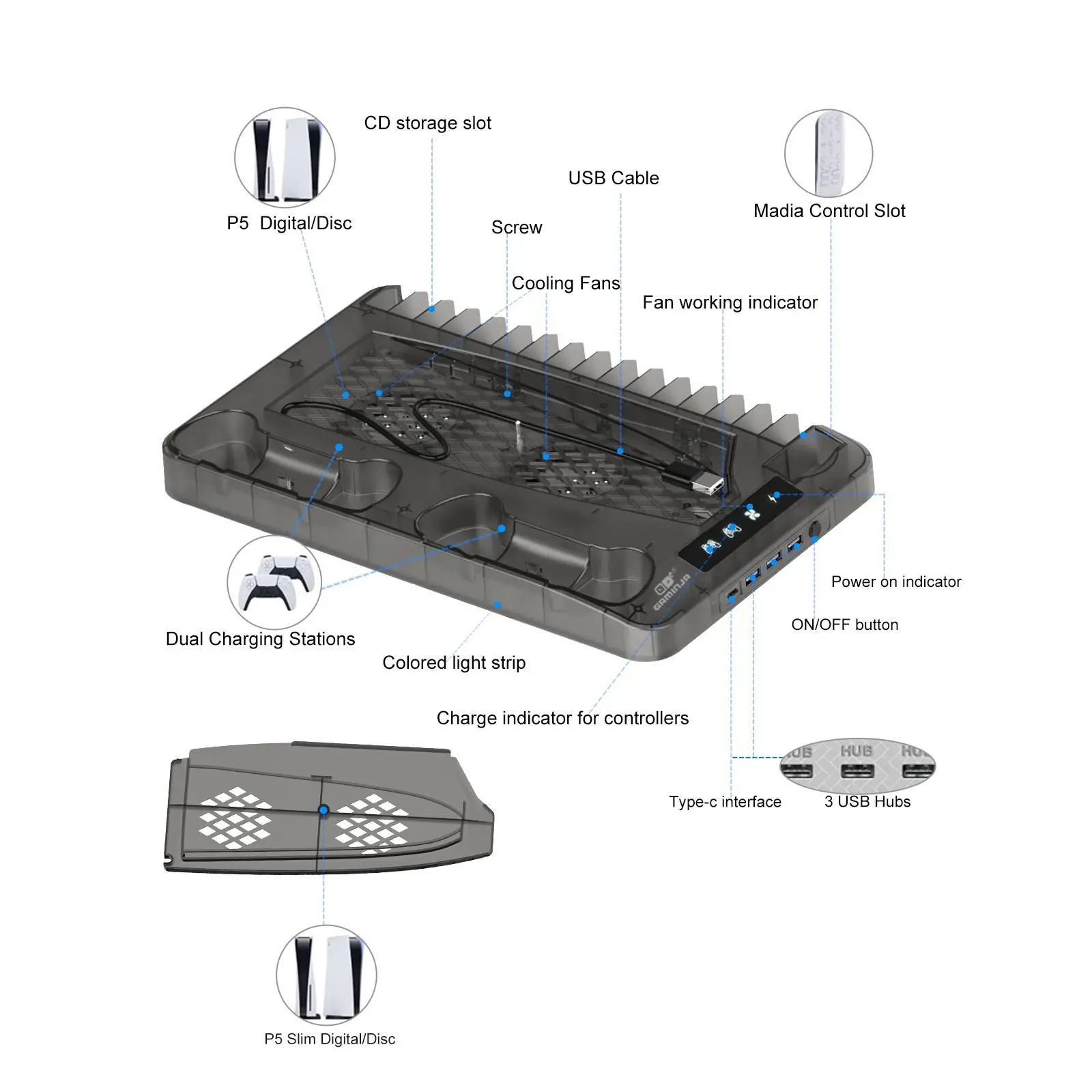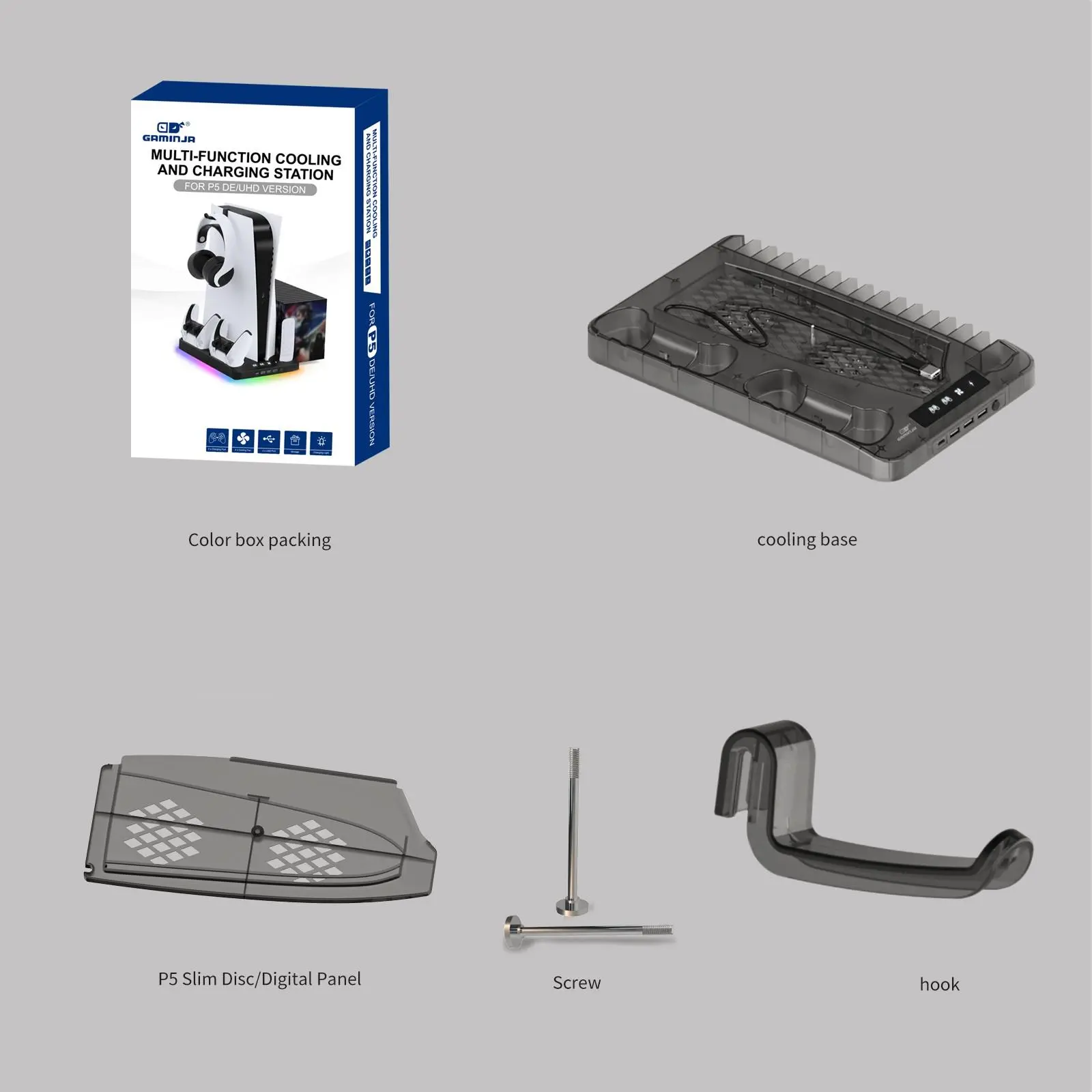 GAMINJA Charging Base for PS5 Accessories, Vertical Cooling Stand, Charging Base with Hook for PS5 Controller, Console Accessories for PS5/PS5 Slim Host, Gifts for Boyfriend