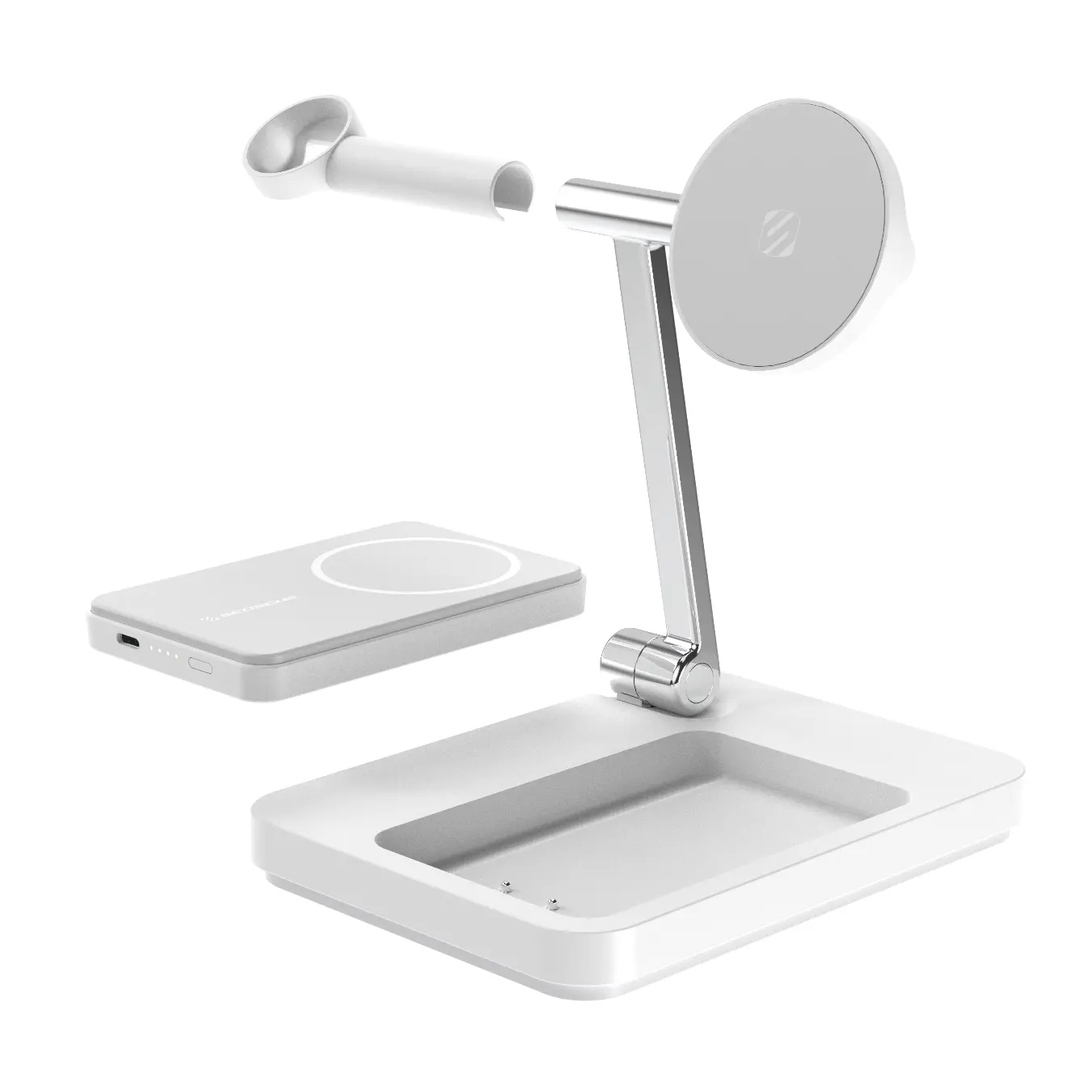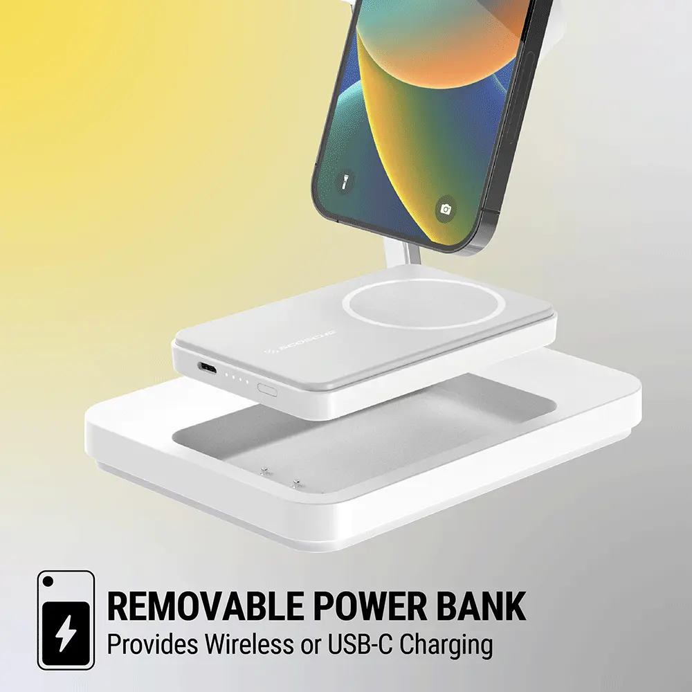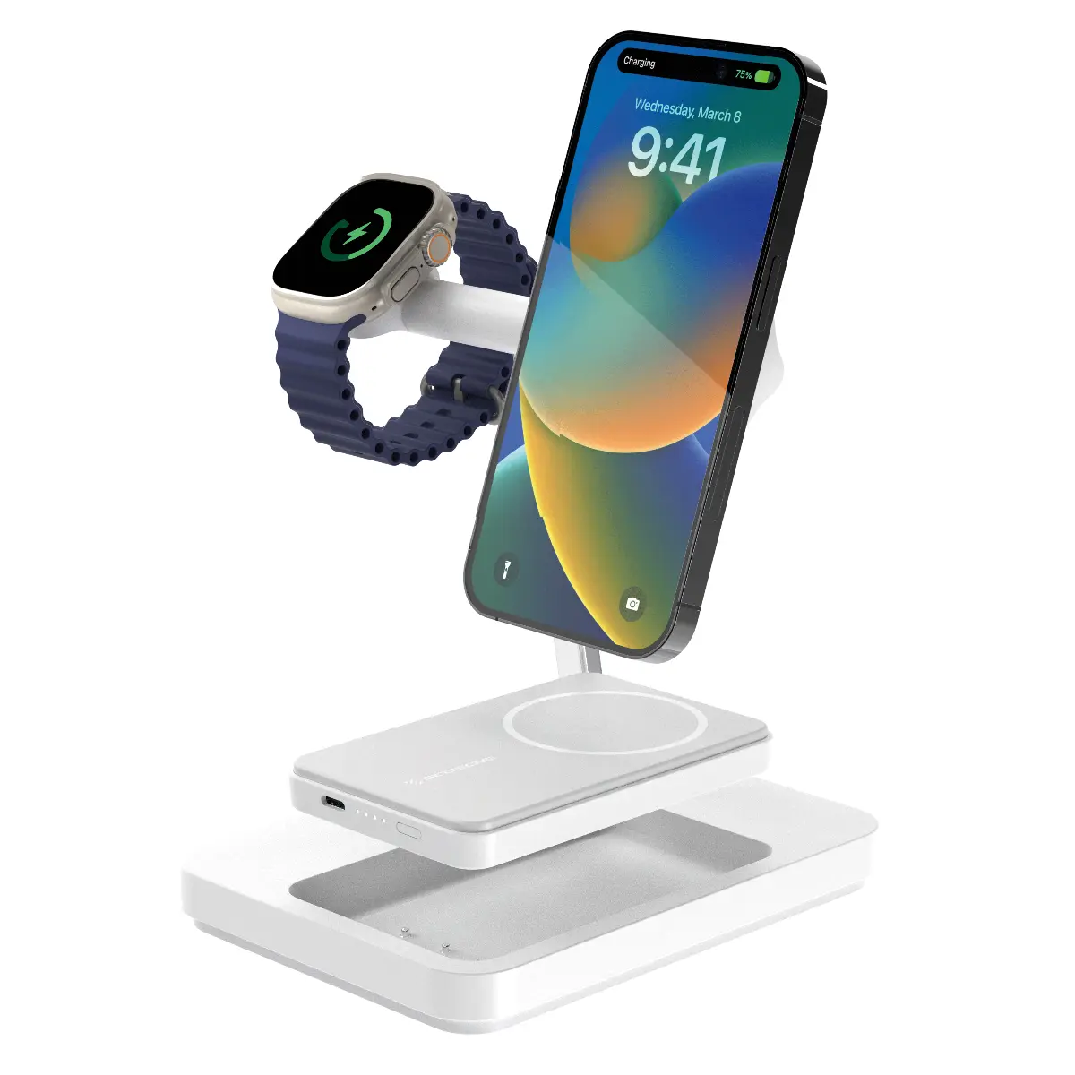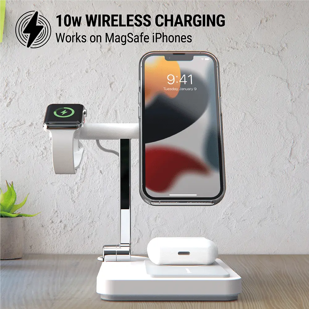 The USB-C port powers an Apple Watch charger, phone, tablet, or camera. It offers up to 10W wireless charging rate, varying according to the device. The compact design fits easily in any room. It also includes a removable Apple Watch holder with a cable channel for charging.
