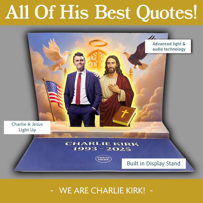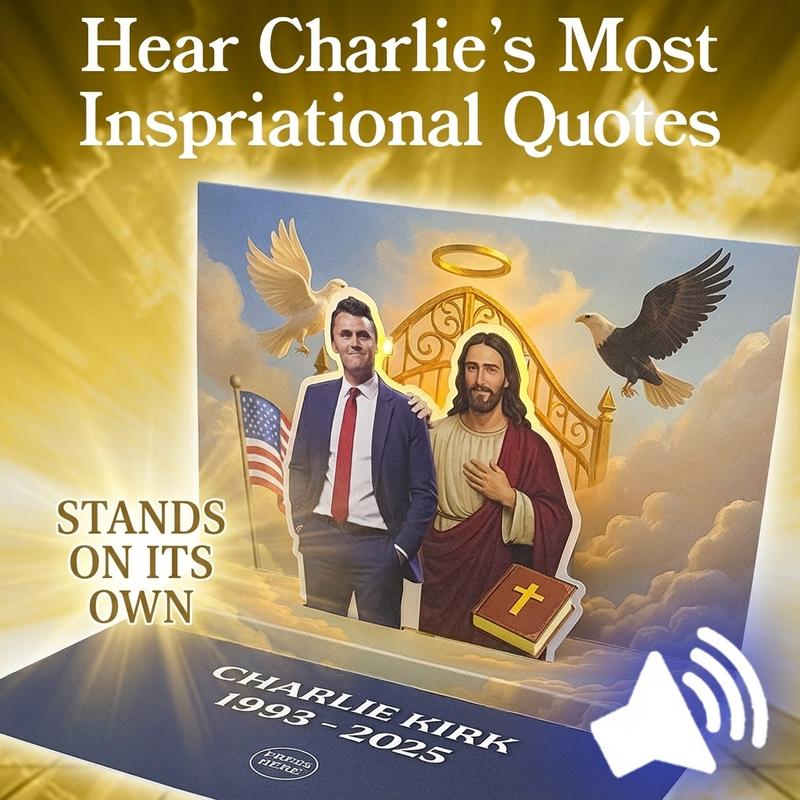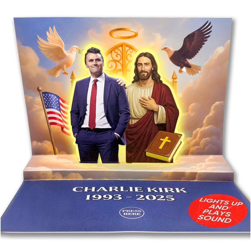 ·A TALKING TRIBUTE TO CHARLIE KIRK'S LEGACY - Honor a conservative icon with this stunning tribute card that LIGHTS UP and SPEAKS! Press the button to hear 15 of Charlie's most powerful quotes in his real voice. The 3D pop-up scene features Charlie standing with Jesus at the gates of heaven—a breathtaking display of faith, freedom, and legacy. The ultimate Charlie Kirk collectible for true believers.