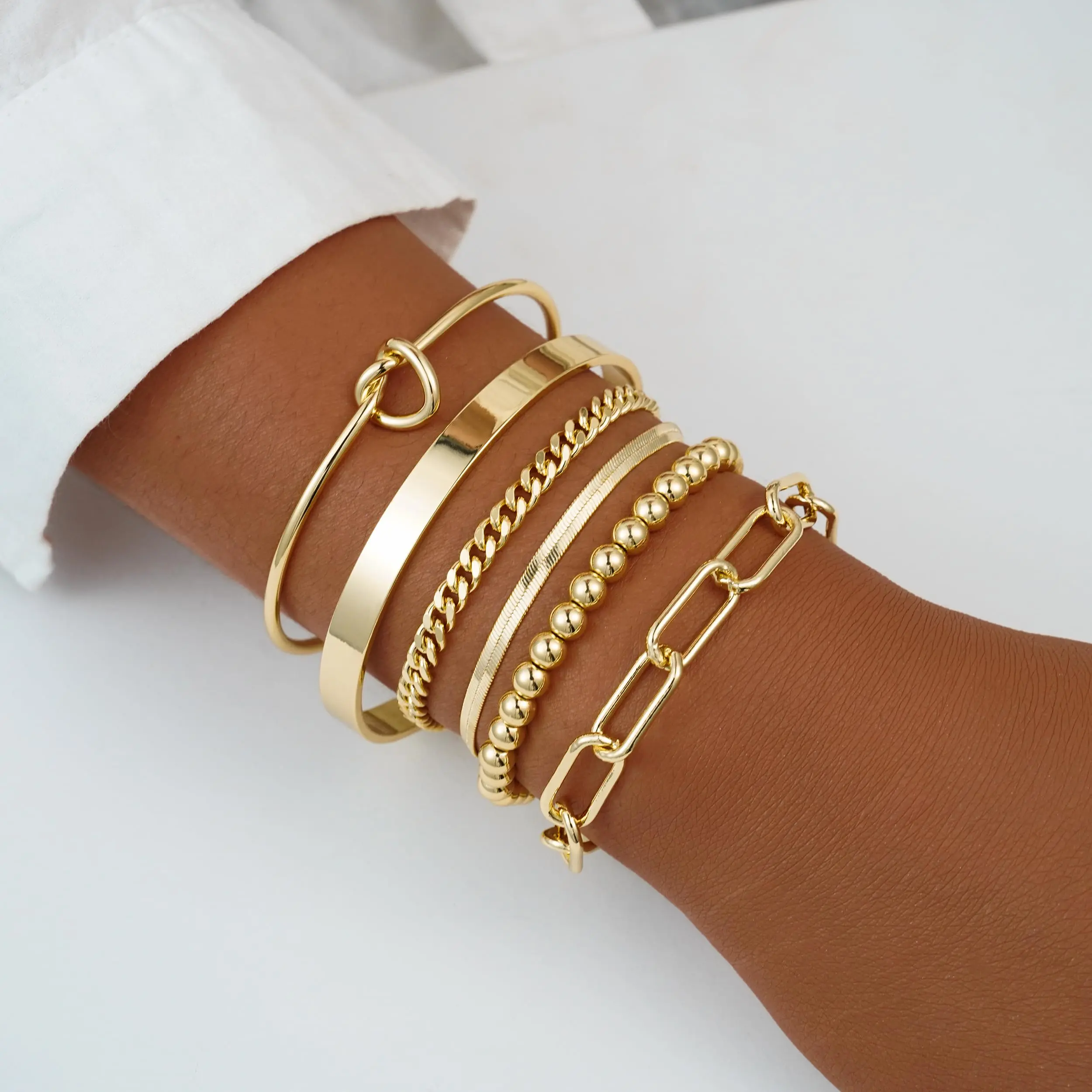 This set includes six unique gold bracelets: simple gold bangles, tie bangles, paperclip bracelets, beaded link chains, cuban bracelets, and herringbone. Wear them alone or stack them for a chic look. Perfect for women who love versatile jewelry.