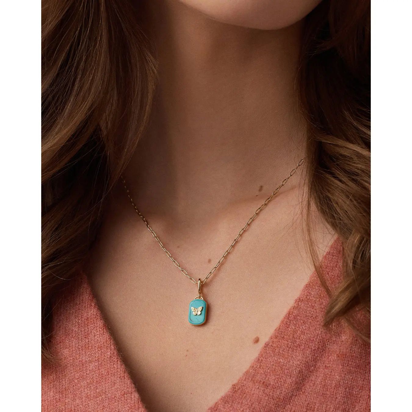 Love love love this necklace!! It is a beautiful quality piece! I have had it for over a month now and wear it almost daily in Texas heat and it has not tarnished or changed color at all! Super impressed! I bought the 20” and added the charm (sold separate) and it sits perfectly atop my shirts.