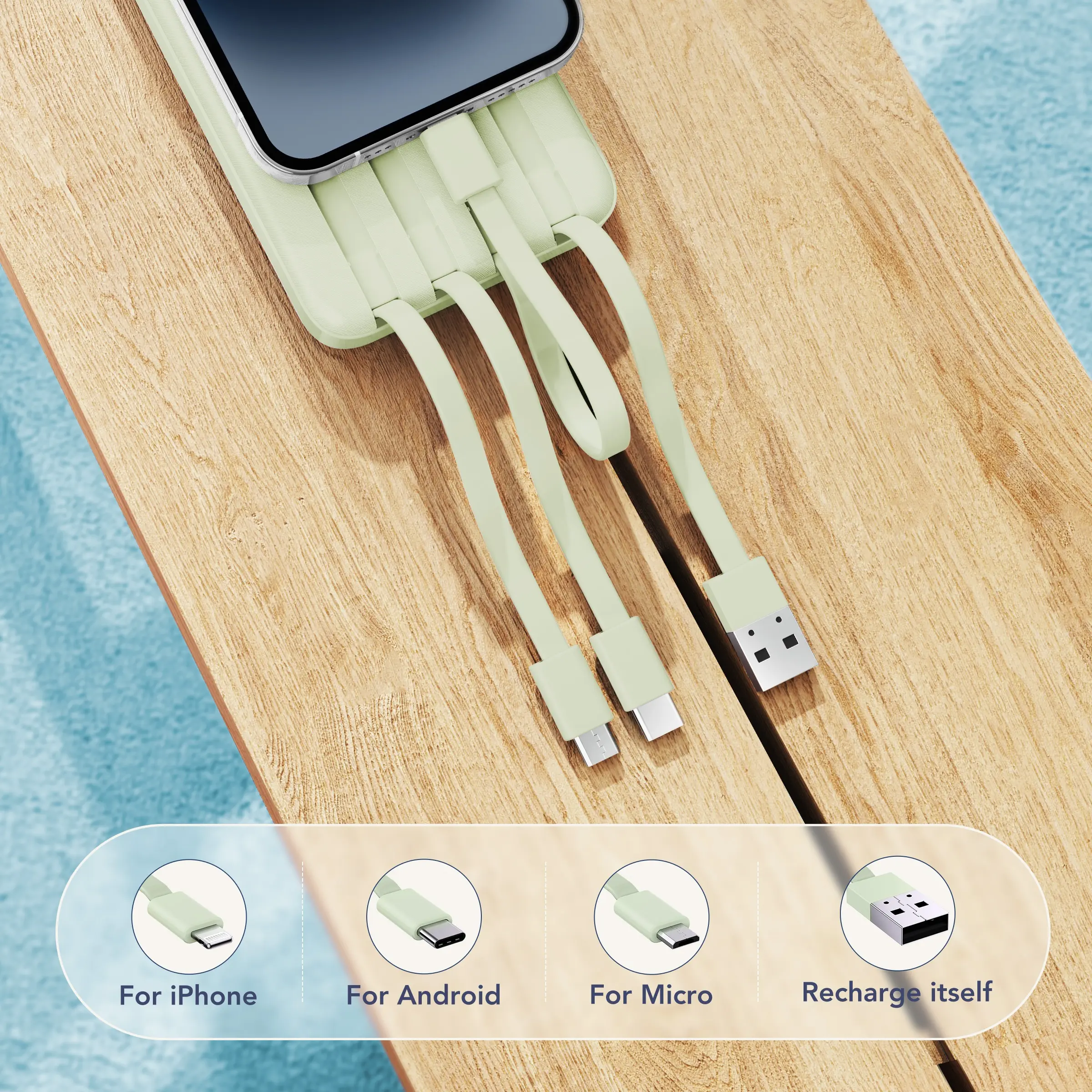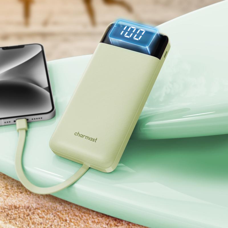 Ever been caught with a dead phone right when you need it most? The Charmast Ultra-Slim 10000mAh Portable Charger is your new travel buddy, packing serious power in a slim, lightweight design. With four built-in cables covering Lightning, USB-C, Micro-USB, and USB input, this power bank eliminates messy cords and keeps all your devices charged—whether you’re team iPhone, Android, or anything in between. Charge up to six devices at once using the built-in cables plus three additional ports, making it perfect for friends, family, or your own tech arsenal. The smart LED display shows you exactly how much juice is left, so you’re never caught off guard. Plus, its 10000mAh capacity means reliable all-day power, whether you're commuting, traveling, or just out and about. Airline approved and travel-ready, it fits right in your bag or pocket without weighing you down. Inside the box, you’ll find the power bank ready to power up your day. Ready to ditch low battery anxiety? Grab this ultra-slim charger and keep your devices fueled wherever life takes you.