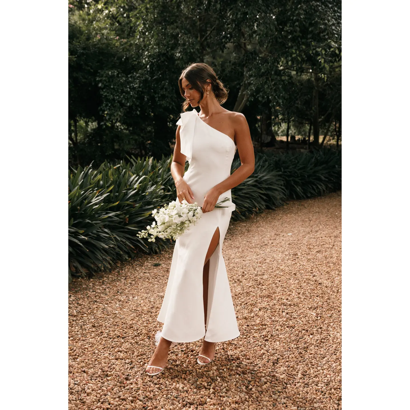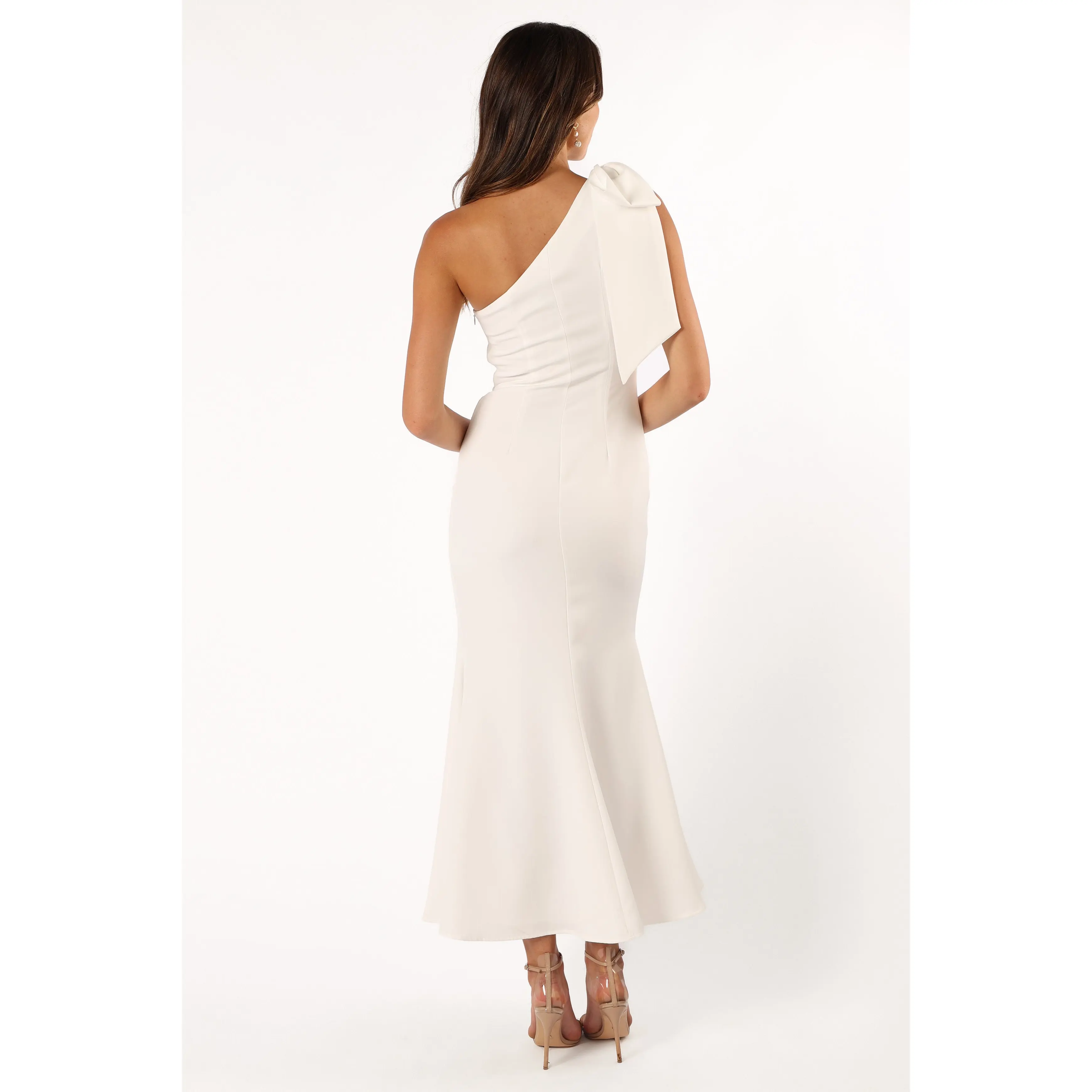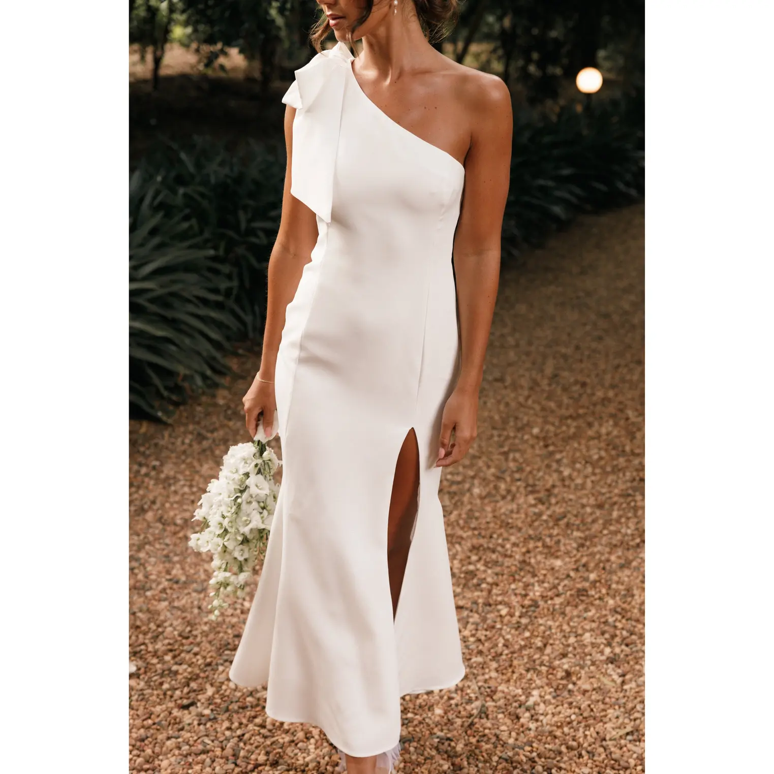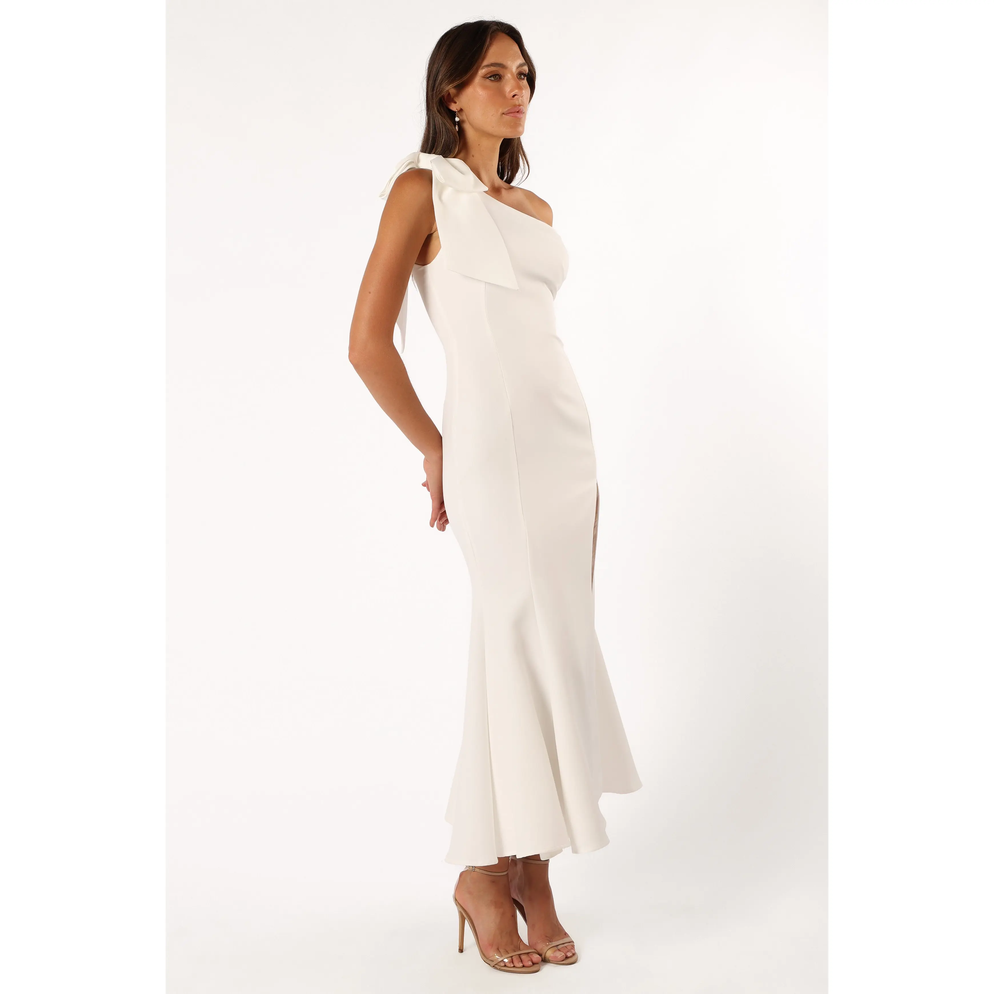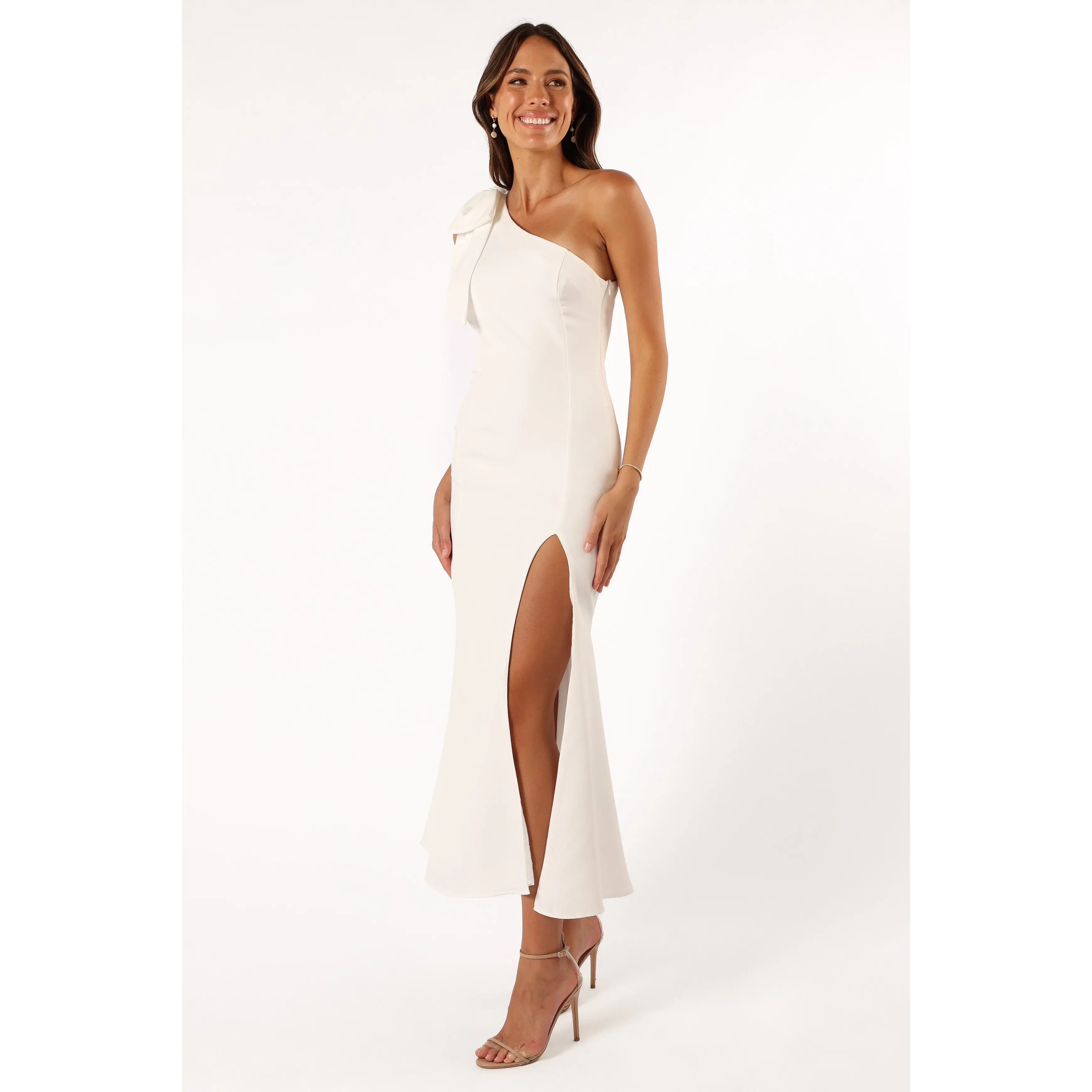 Step out in style with our chic one-shoulder midi dress, featuring a sleek asymmetrical neckline, an elegant bow detail, and a daring front side split. Ideal for any occasion, this sleeveless design is finished with a subtle invisible zip.