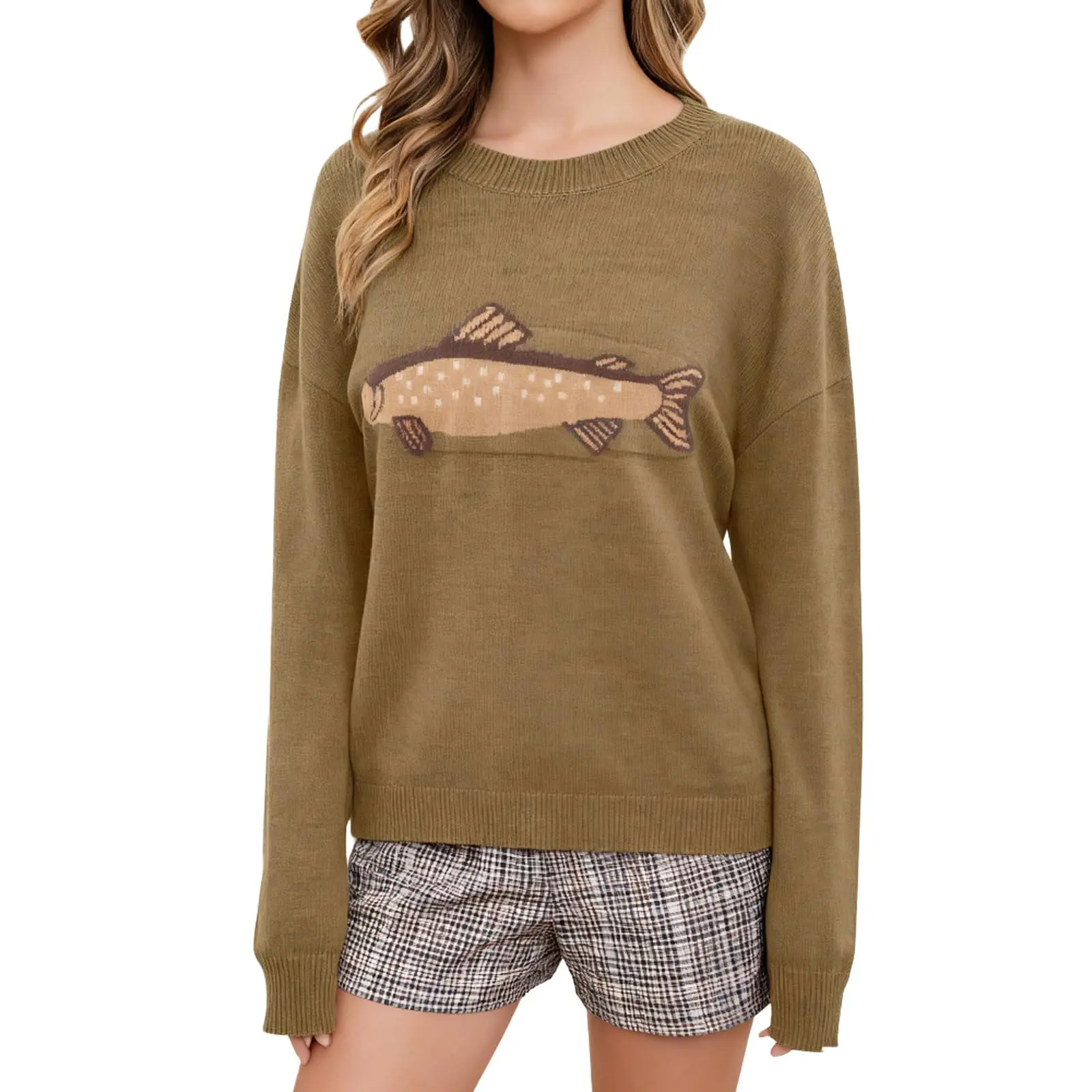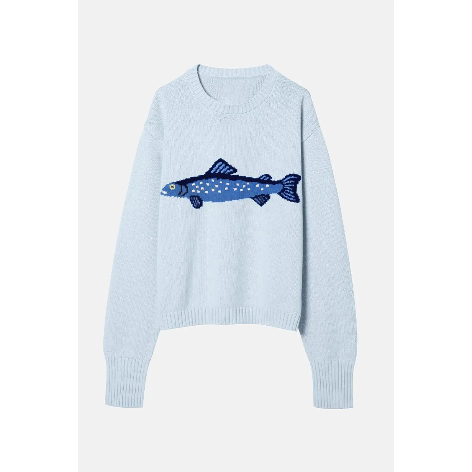 ·Design: Round neckline, long sleeve, drop shoulder, cute carp pattern at front, ribbed trim, oversized style, regular length, relaxed fit, color- light blue, dark green