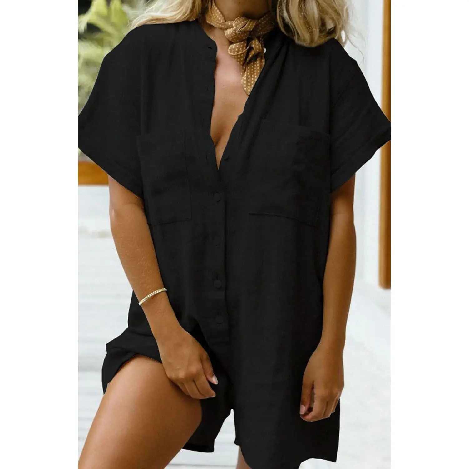 ·【Features】Front button jumpsuit/ mandarin stand collar short romper/ short sleeve overalls/ cuffed short sleeve rompers/ loose wide leg shorts jumpsuit/ 2 chest pockets/ Solid color-Black, Brown, and White