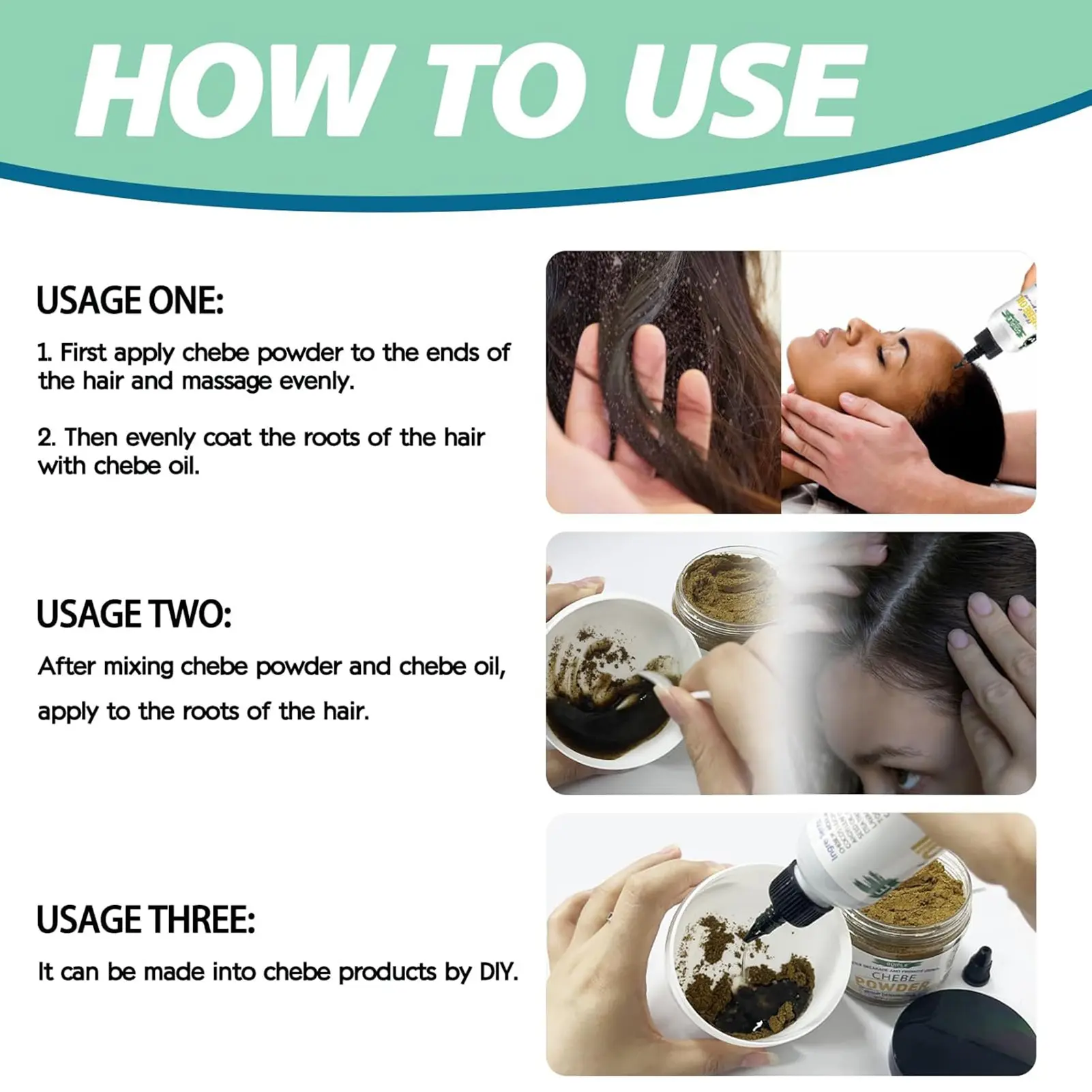 Ā·ć Easy to UsećTo use, the chebe powder is typically mixed with chebe oils and applied to wet hair. The hair is then twisted or braided. When using chebe oil, it can be directly applied to the hair or scalp. Regular application promotes hair strength, reduces breakage, and can even improve hair texture.