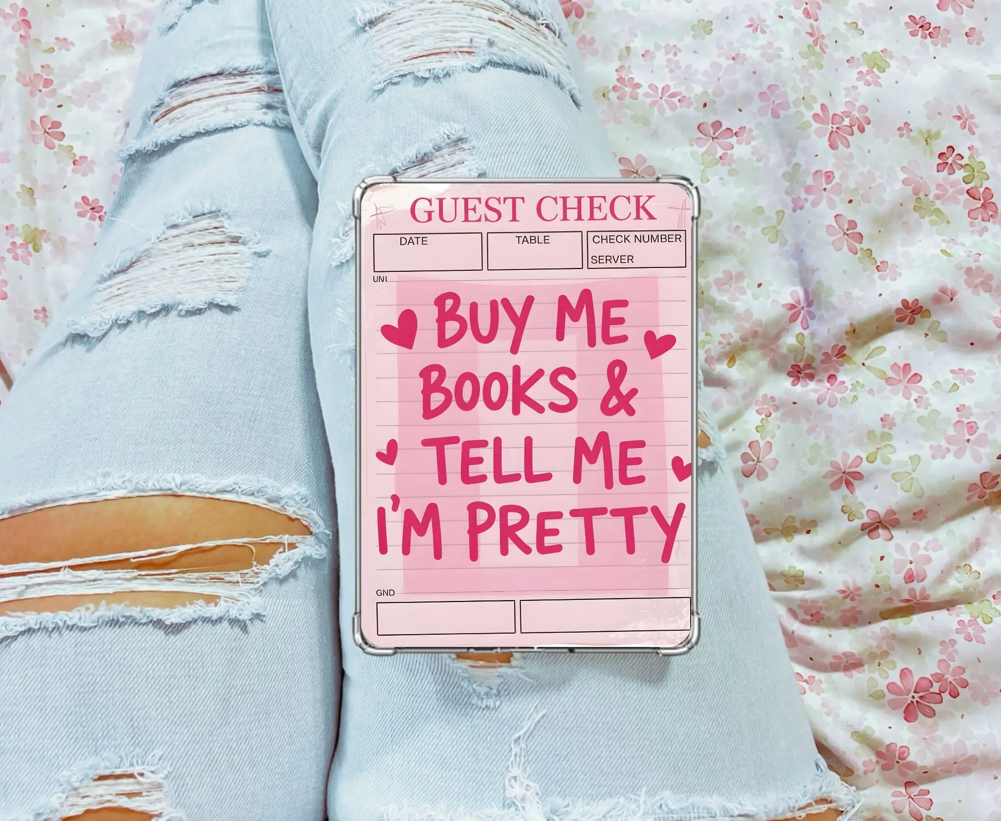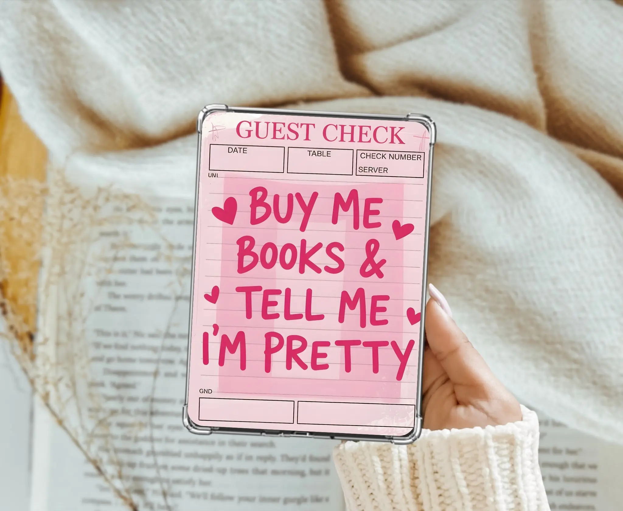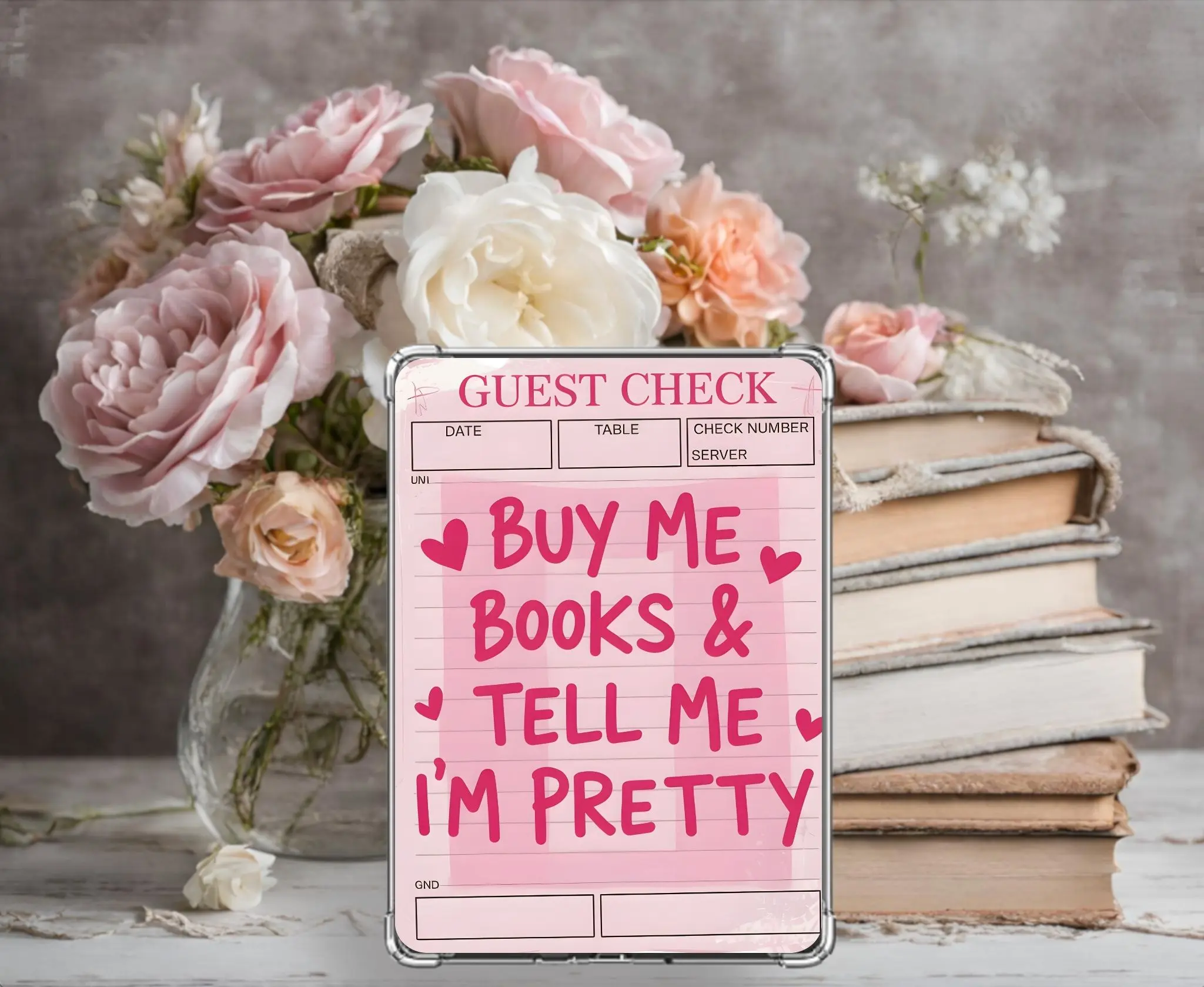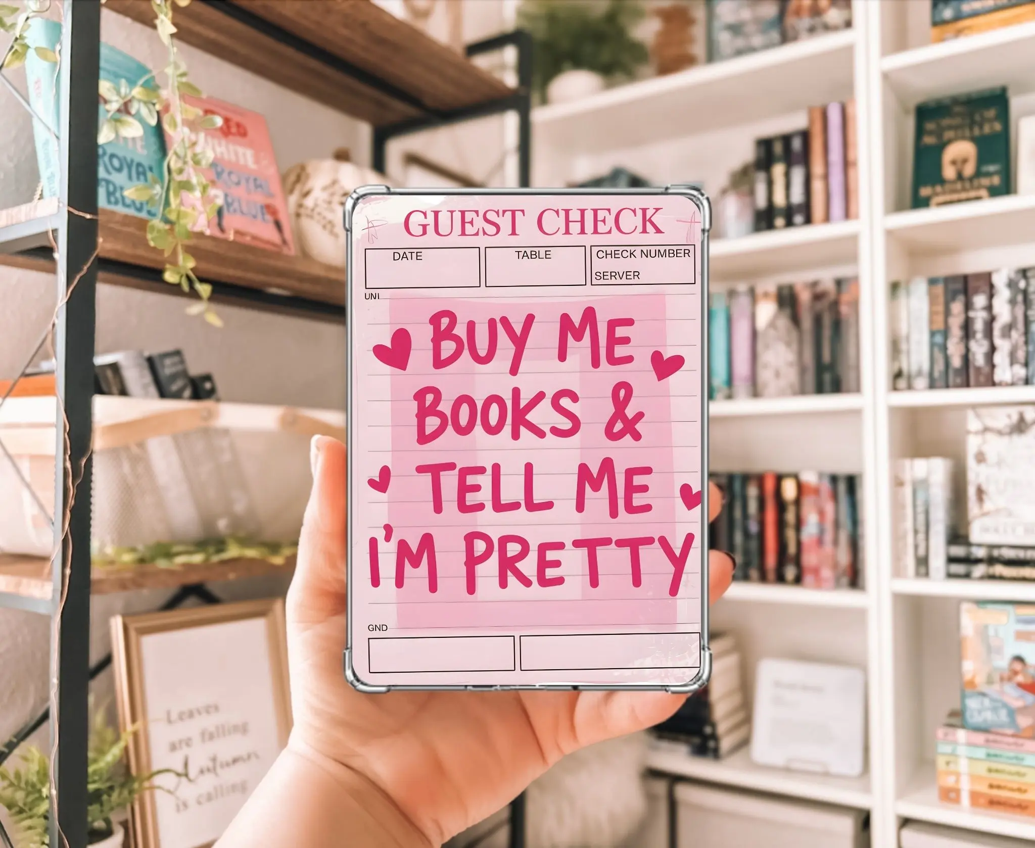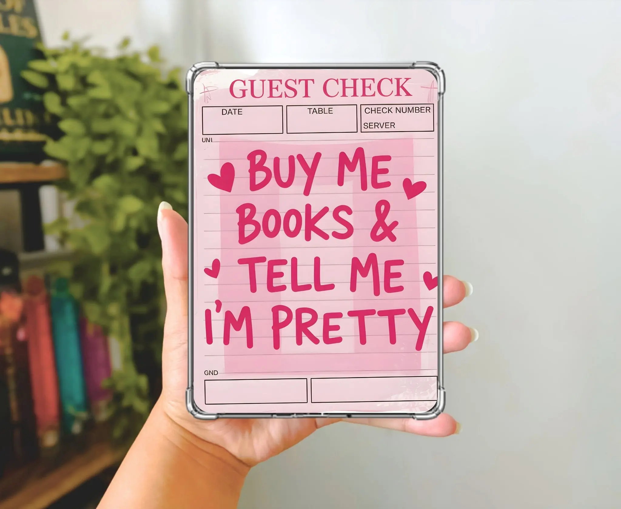 Elevate your e-reader's look with our charming "Check Please" card stock insert. This handmade design fits perfectly inside a clear case, covering the back of your e-reader. It's crafted with precision, ensuring a seamless fit. Add a touch of personality to your device with this unique insert.