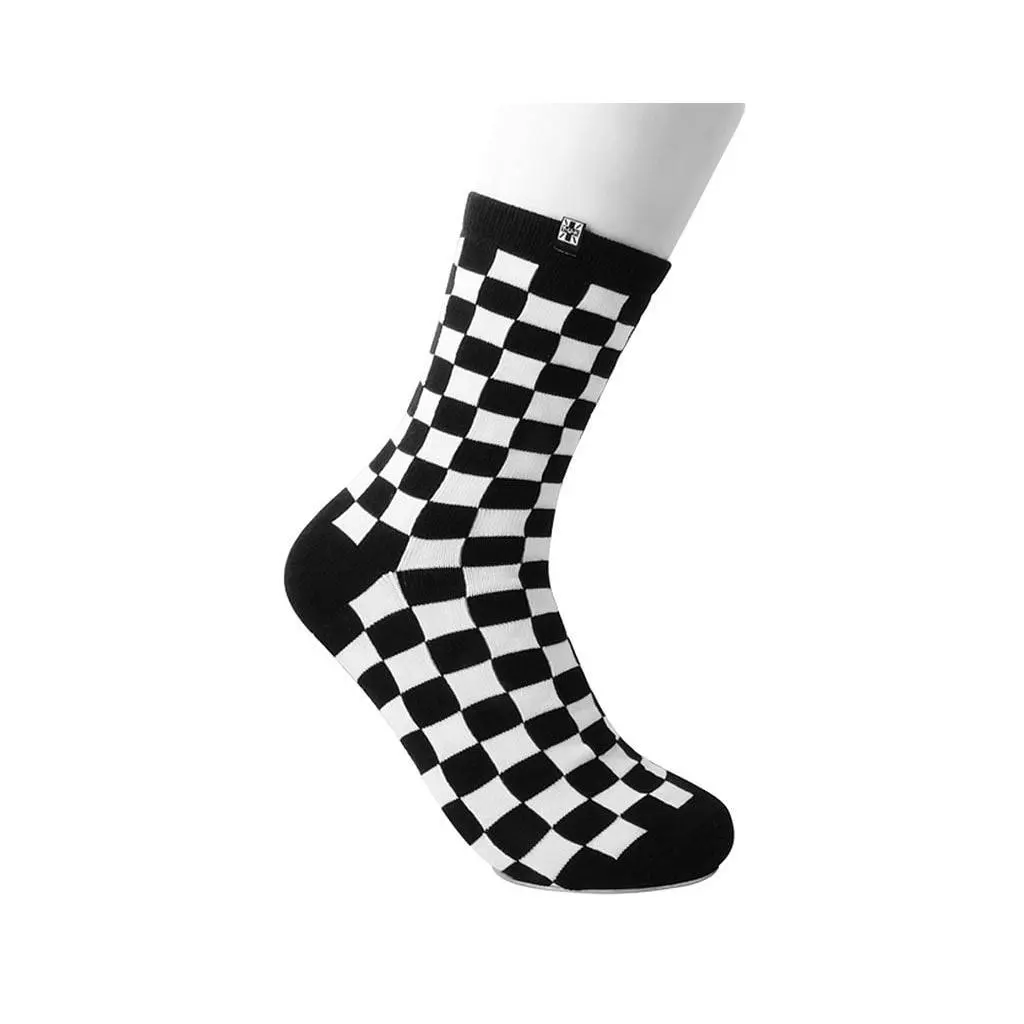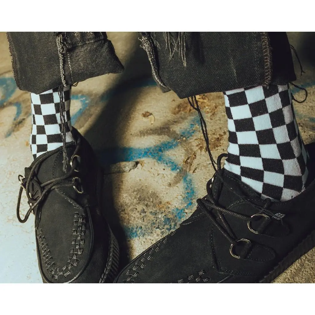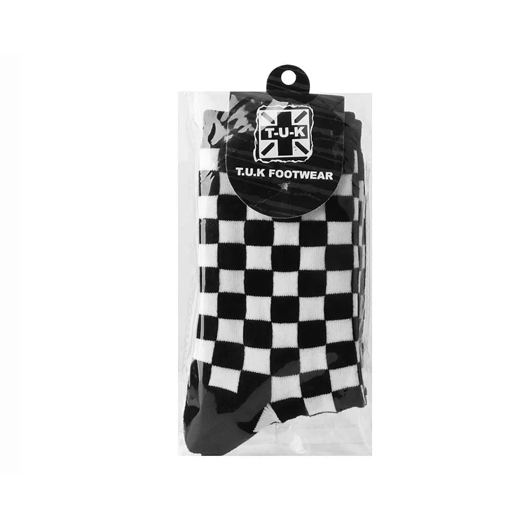 The perfect solemate to your fave pair of creepers. A classic crew sock featuring a black and white checkered design, complete with a T.U.K. logo tab on the side.