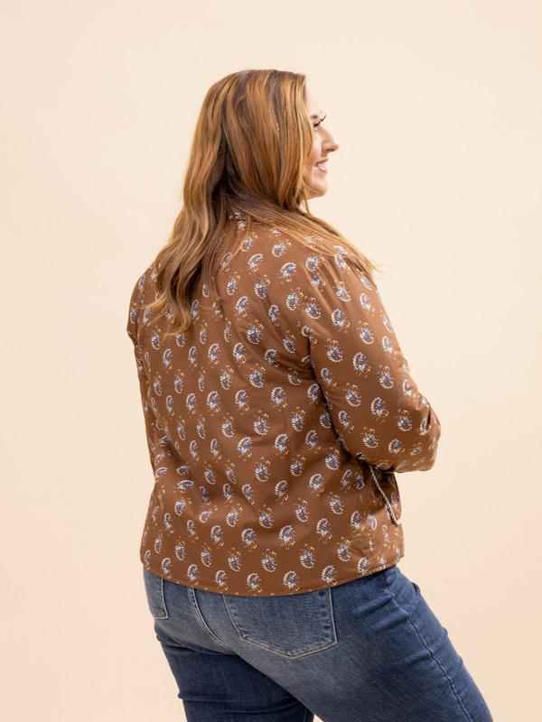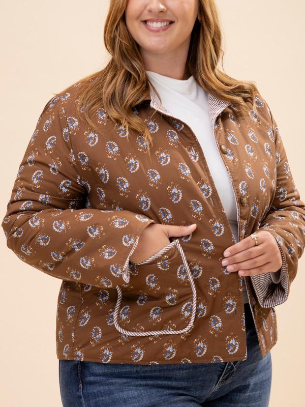 Fit/Sizing: true to size relaxed fit. If you are worried about broader shoulders, you can size up. Maddy (brown hair) is 5’10, typically wears a size S in tops and 5 in denim. Wearing size S Erin (red hair) is 5'8, 36C bra, typically wears size L/XL in tops and 14/15 in denim. Wearing size L Features: Collar, Button Up, Long Sleeves, Pockets, Checkered Lined Floral Jacket Medium Measurements: Bust- 45" / Length- 24" Materials: 100% Cotton Brand: Jodifl sku 65139