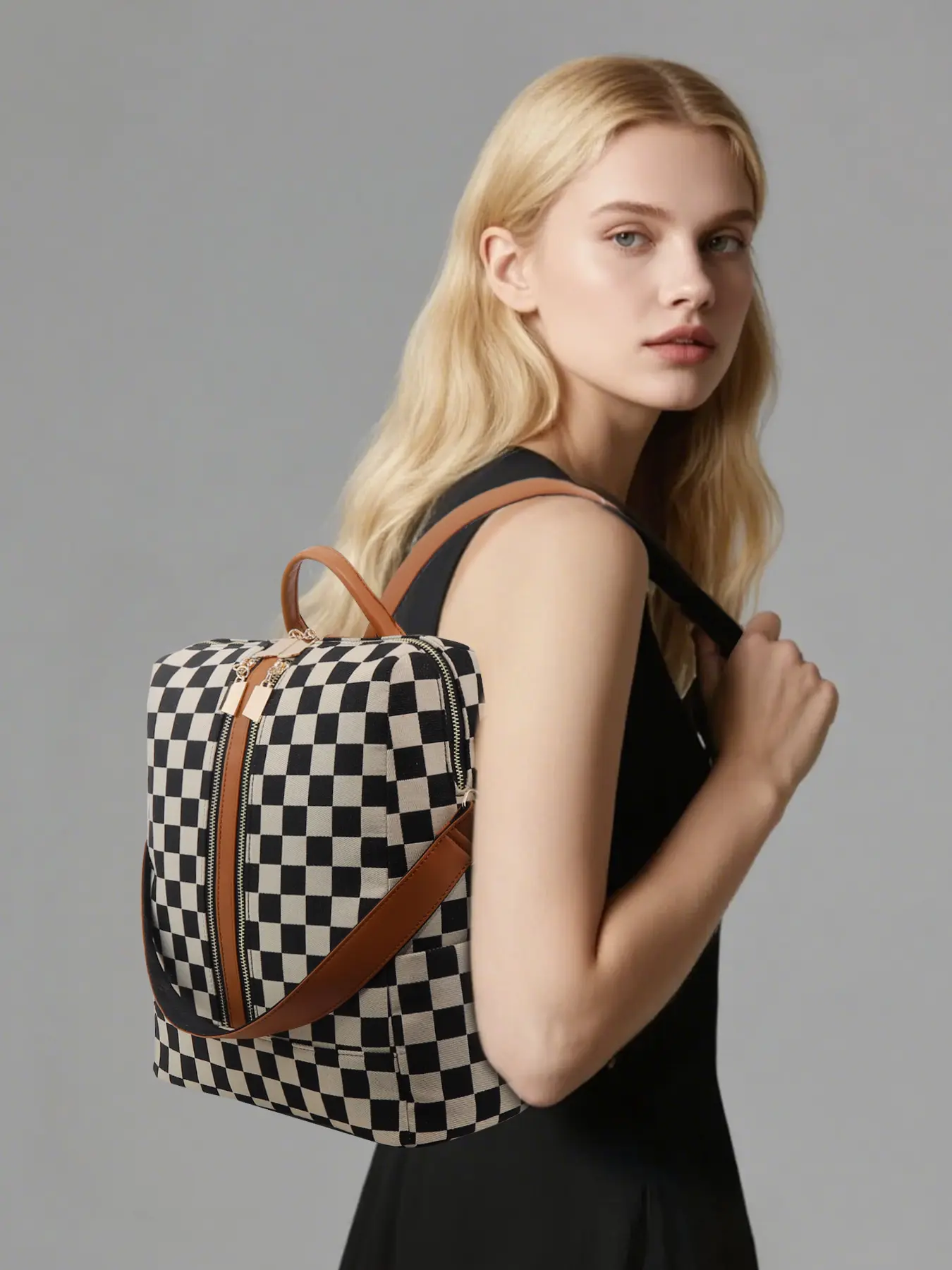 This is a great size backpack. The outer covering is more cloth and woven trimmed in PU. Inside is a nylon easy to wipe clean material. It’s a high quality item. The zippers and sewing is nicely done. Great for a handbag diaper bag or to carry a smaller laptop!