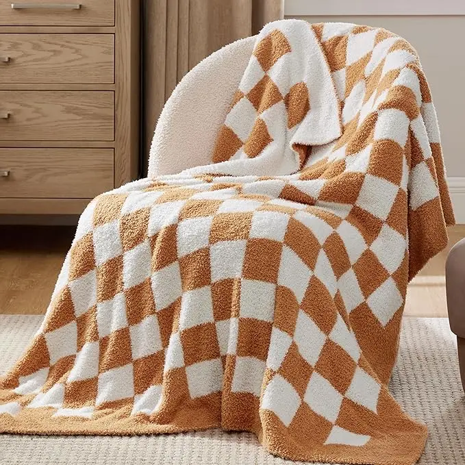 Bedsure Checkered Blanket for Couch - Super Soft, Cozy & Warm Knit Blanket, Breathable, Lightweight & Fluffy for Bed & Sofa, Checkered Camel