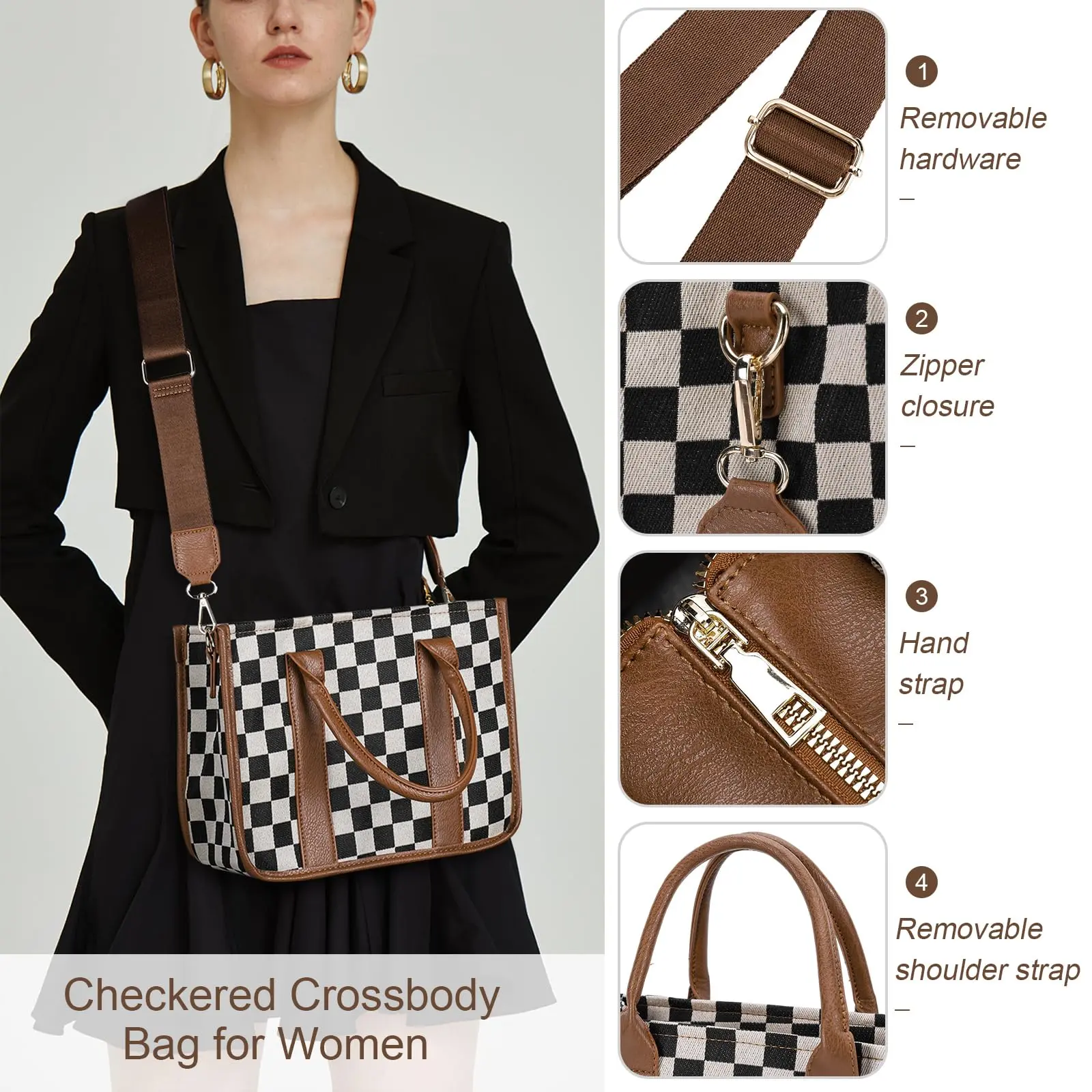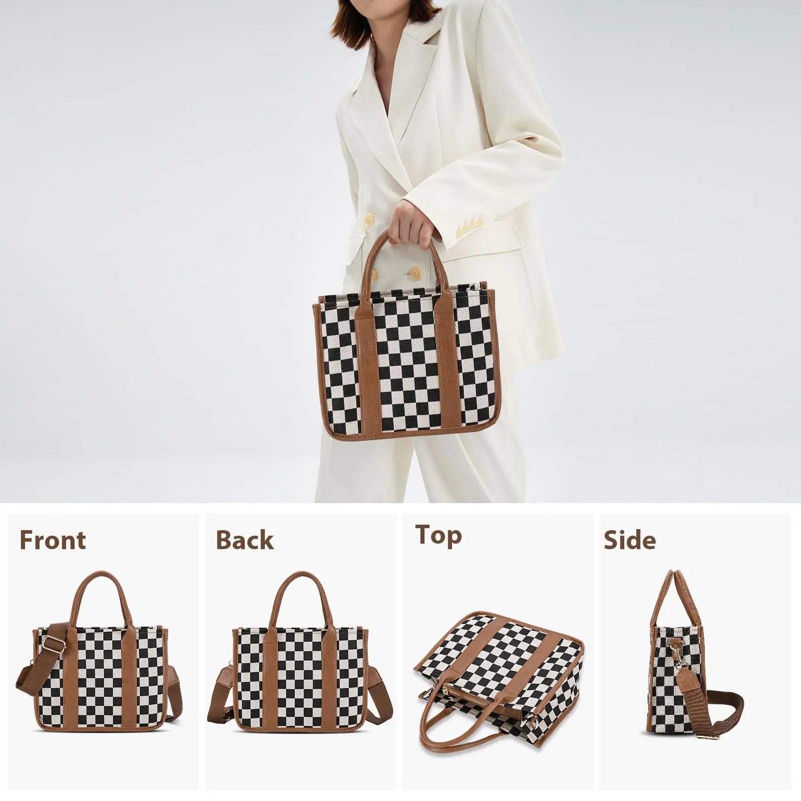 5. Checkered Crossbody Bag, Canvas Work Tote, Black and White Purse, Casual Tote Handbags for Work & Travel