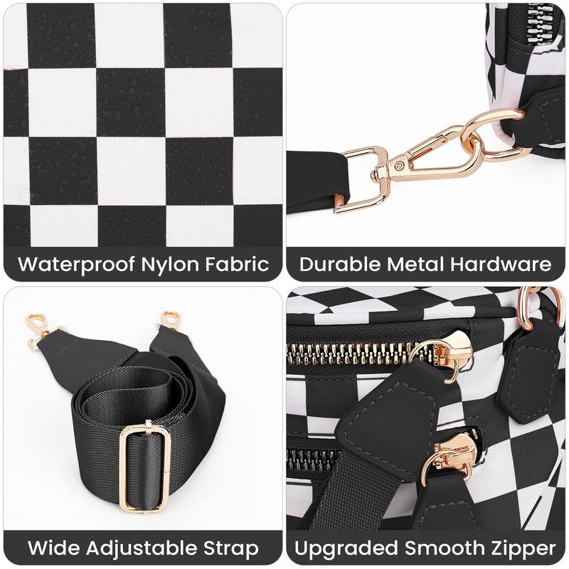 Elevate your travel game with this checkered crossbody bag. Crafted from nylon, it's a lightweight fanny pack perfect for carrying essentials. This large belt bag offers versatile storage options, making it ideal for trips. The design ensures comfort and style, with a checkered pattern adding a touch of flair. Carry it as a crossbody or fanny pack for convenience.