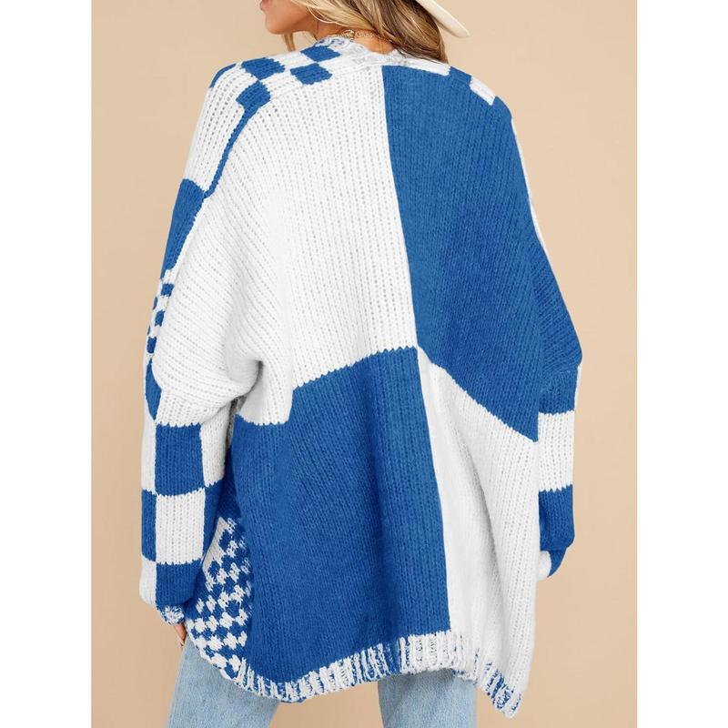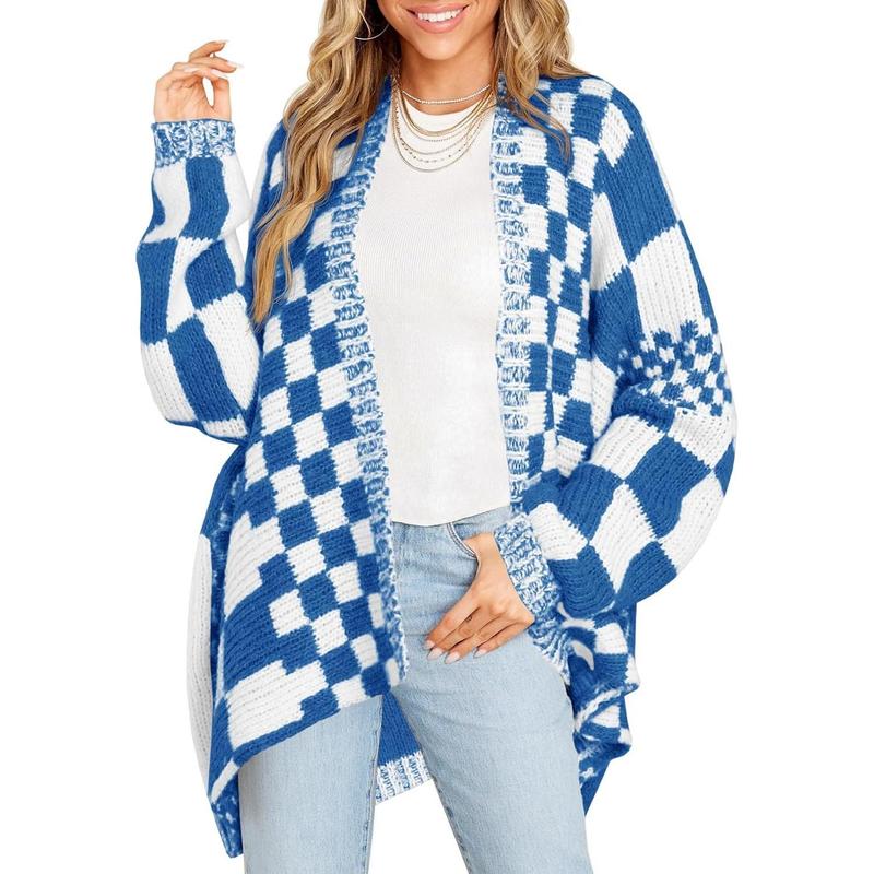 LADIES PLAID OPEN FRONT CARDIGAN COLORBLOCK CHECKERD WARM KNIT COATS