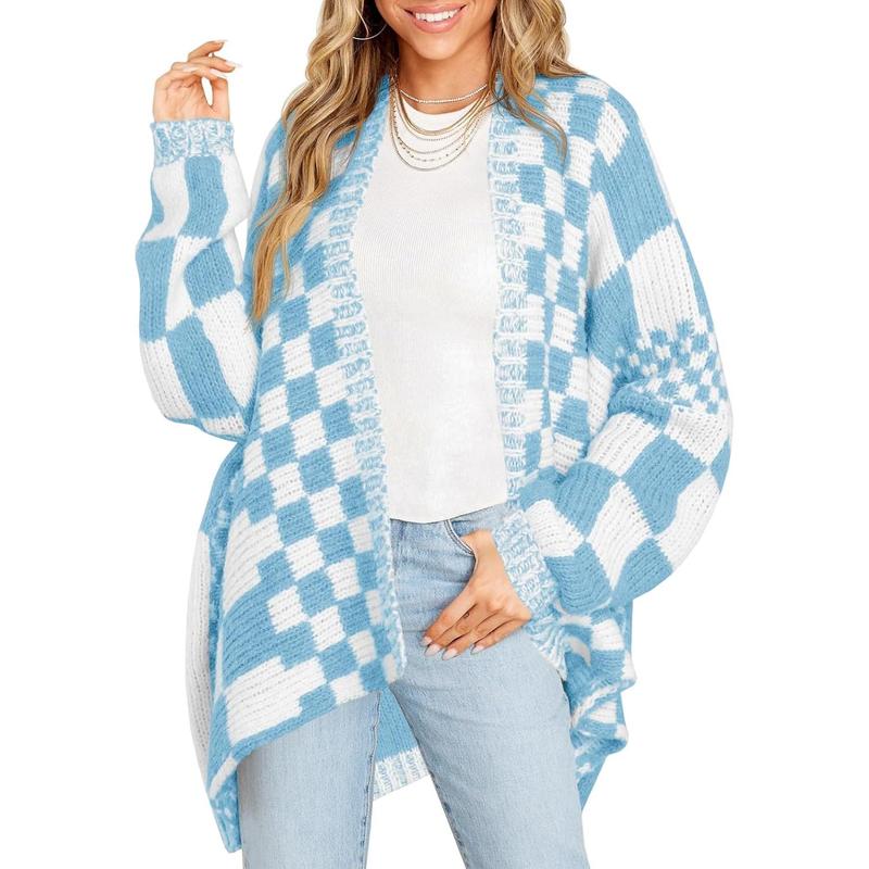 WOMENS CHECKERED OPEN FRONT PLAID COLOR BLOCK SWEATER CARDIGANS