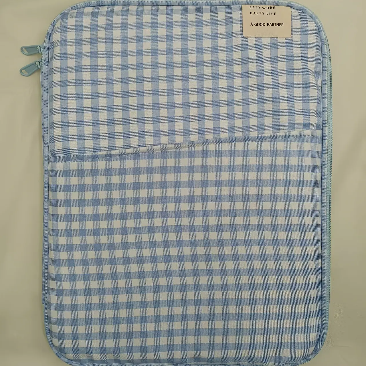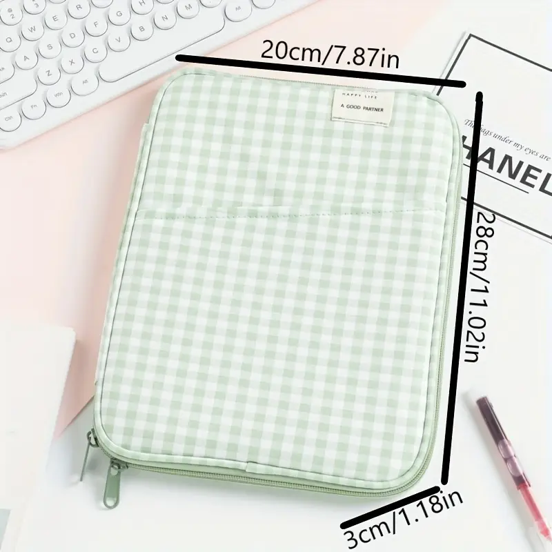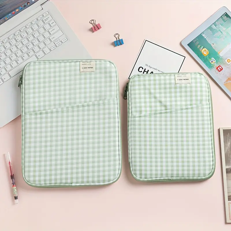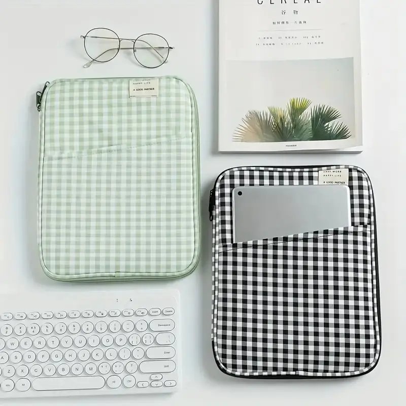 This checkered tablet and laptop sleeve features a foldable soft polyester case. It includes multiple compartments for organized storage. Perfect for iPad, MacBook 13-inch, and laptops. The durable protective cover ensures your device stays safe. 📚