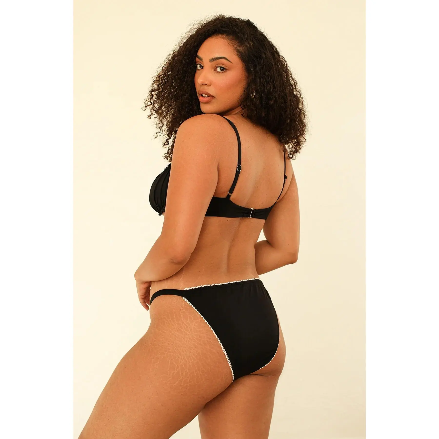 A feminine and cheeky-fit bikini bottom with lace lining and bow details to make you feel extra pretty. Jane is best paired with our Bridget Top.