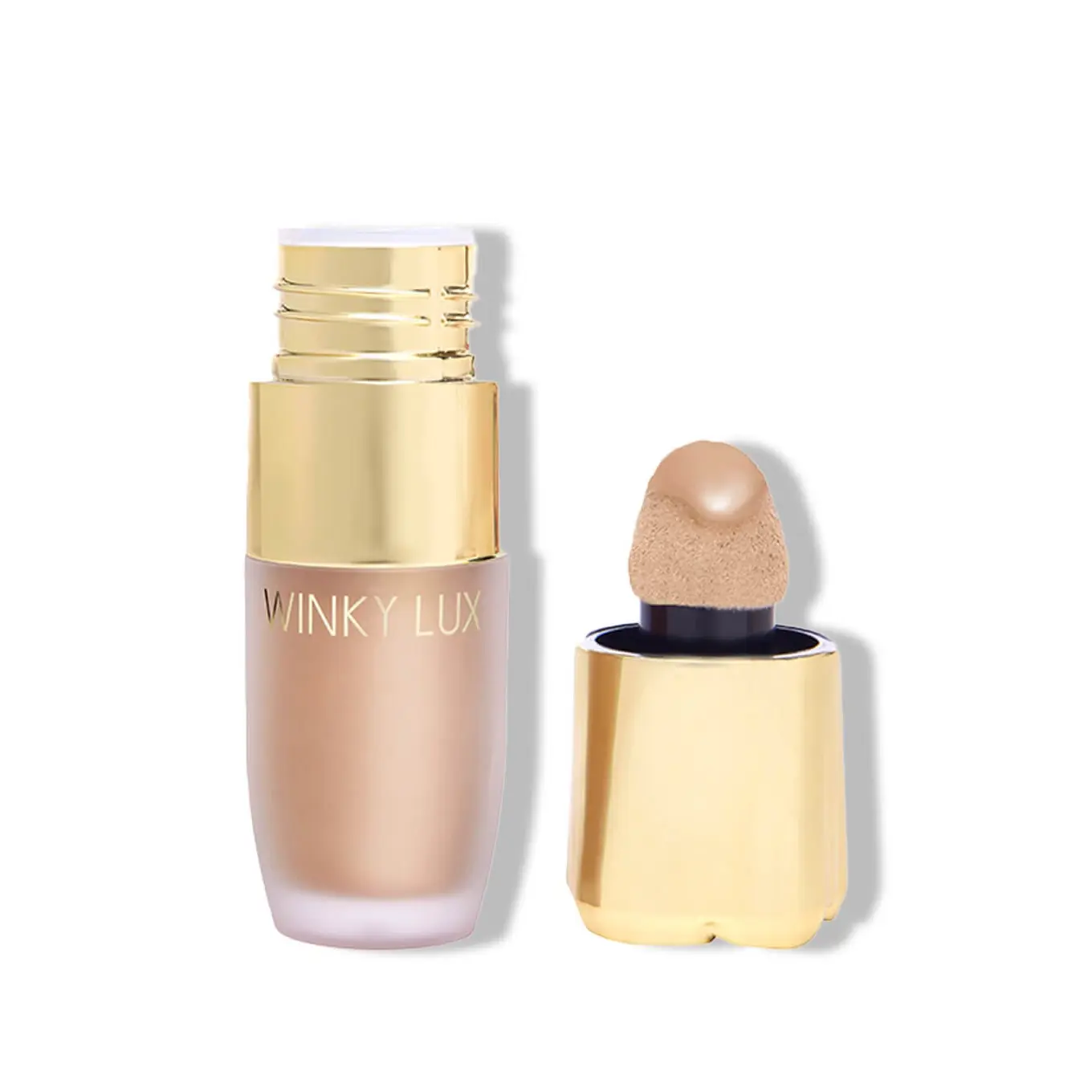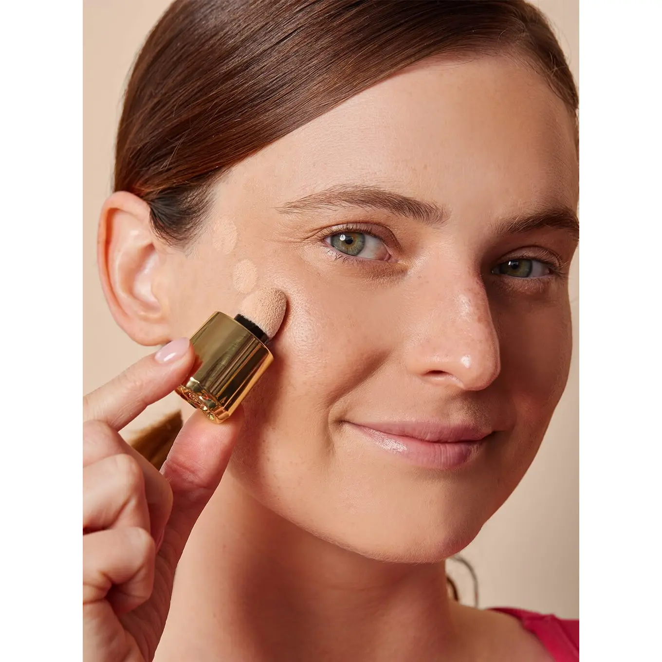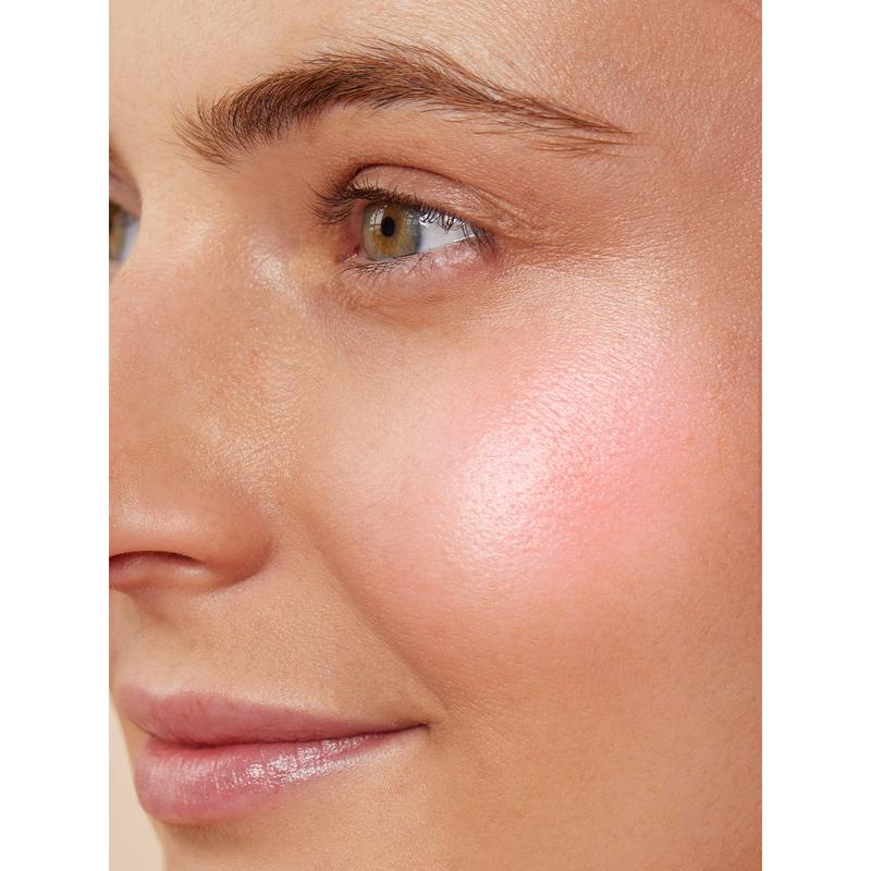 Shake well, dot onto high points of face (such as cheekbones, brow bones, and cupid’s bow), and blend out with fingers, sponge, or a brush.