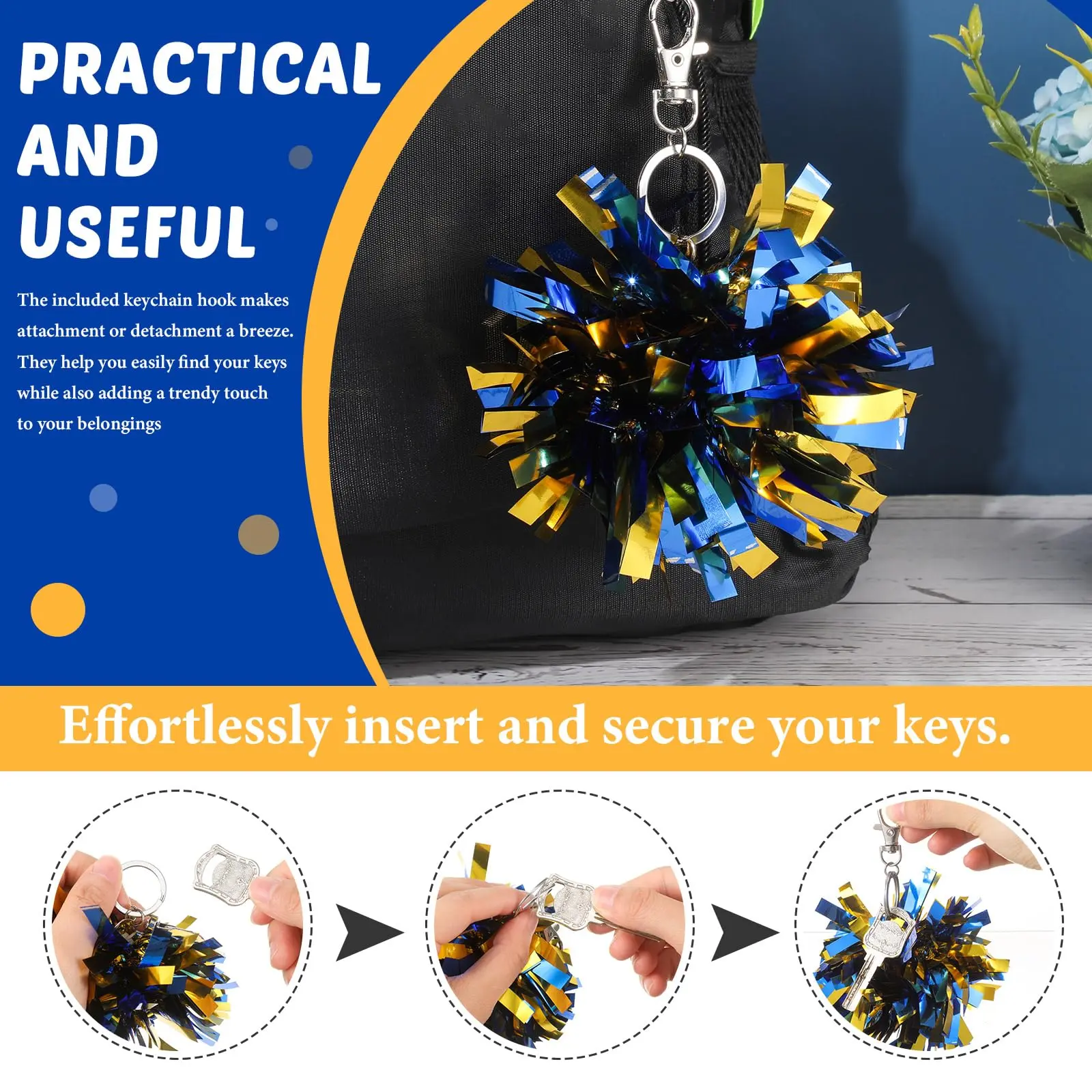 👯♀️Why you will love it :These pom pom keychains are made of quality plastic and metal for durability, and feature nonfading, shimmering black and gold foil; They catch the eye, boost cheerleading spirit, and show your strong support for the team.