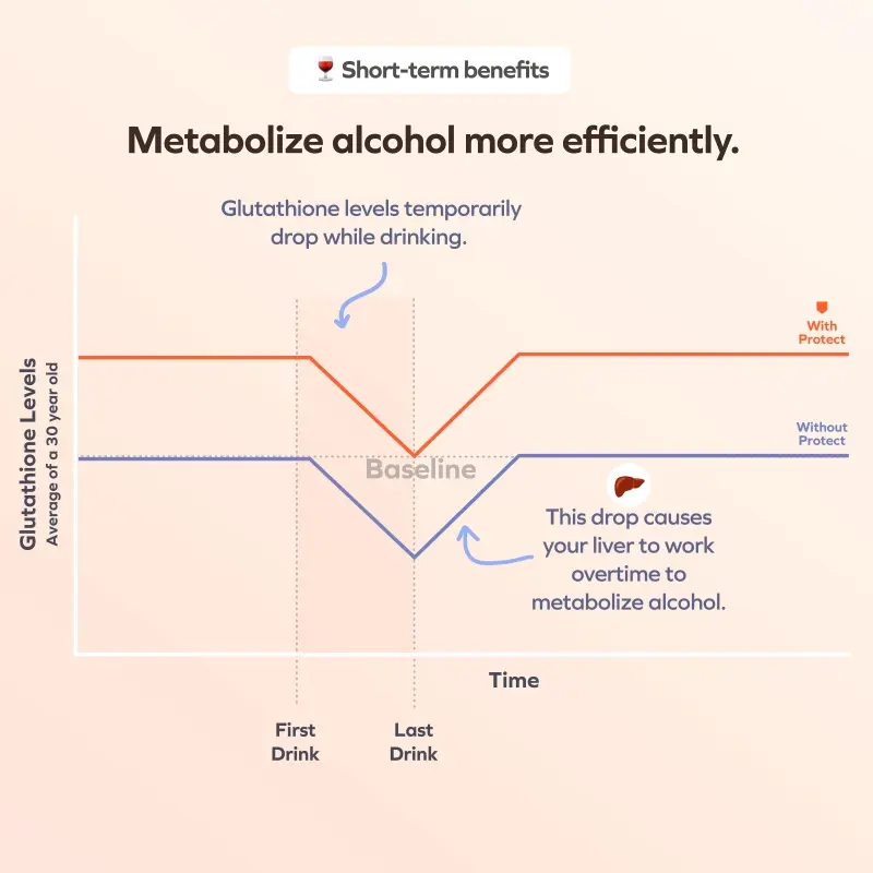 ·Glutathione is known as the “master antioxidant”, tirelessly working to neutralize toxic substances. For example, consuming alcohol creates oxidation and temporarily drops your glutathione levels, making it more difficult for your liver to process those toxins. Additionally, as you age, your glutathione levels naturally decrease. Taking a daily dose of Cheers Protect will increase your glutathione levels so that your liver can process toxins more effectively.