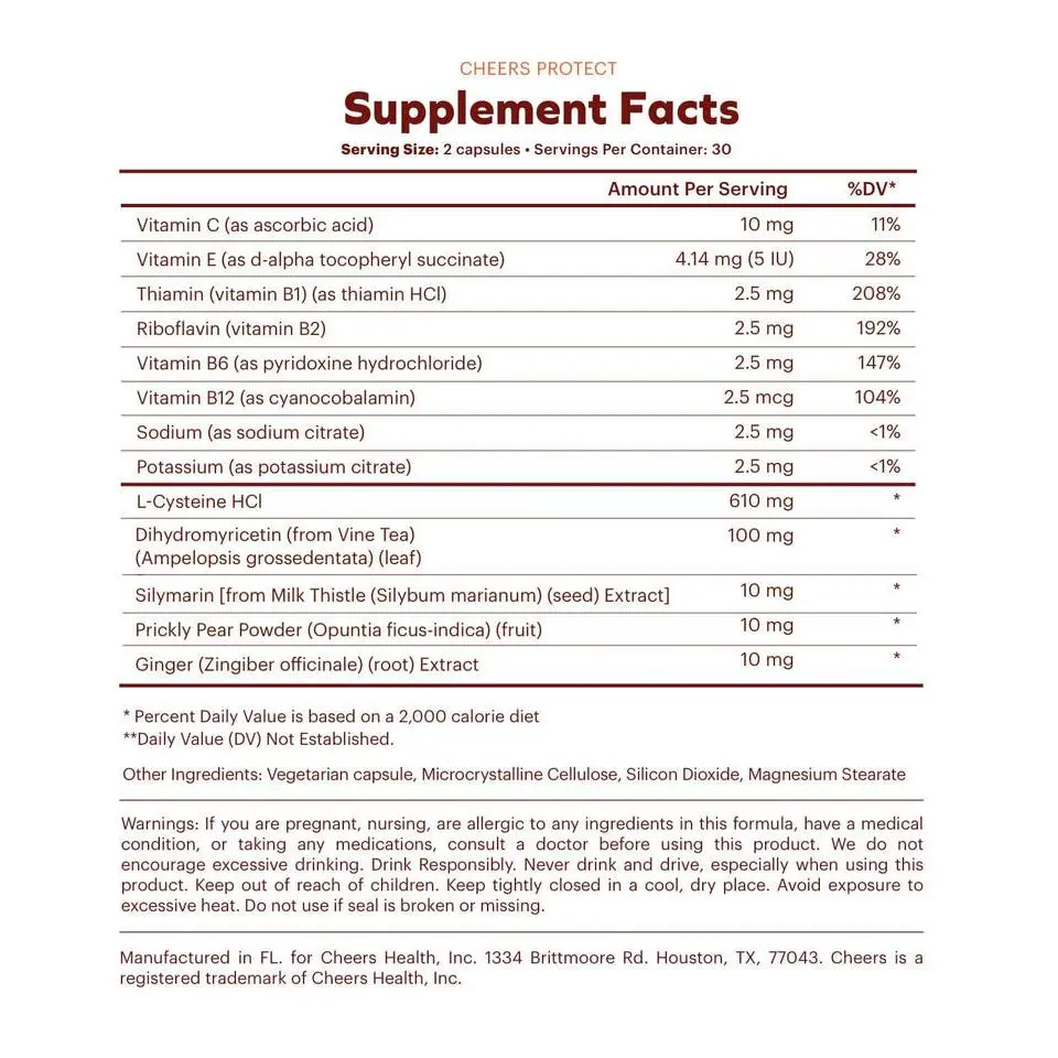 ·Our liver capsules contain powerful ingredients like Cysteine, milk thistle extract, ginger extract, DHM, Vitamin C, Vitamin E, Vitamin B1, Vitamin B2, Vitamin B6, Potassium, & more. No need for a separate ginger supplement or milk thistle capsules when you have all you need in Cheers Protect.