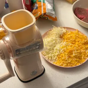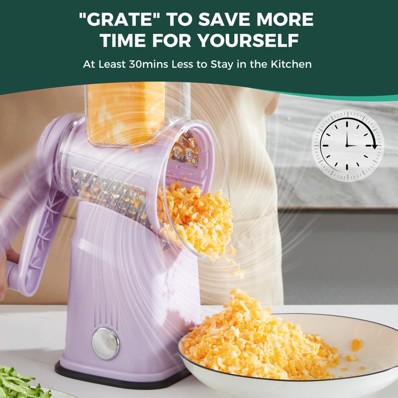 Busy weeknights? This 5-blade rotary grater gets your prep done fast and easy! Shred cheese, carrots, cucumbers in seconds. The strong suction base holds tight so you can shred with one hand—no slips, no stress. Save time, spend more moments with your family, and enjoy cooking made simple.