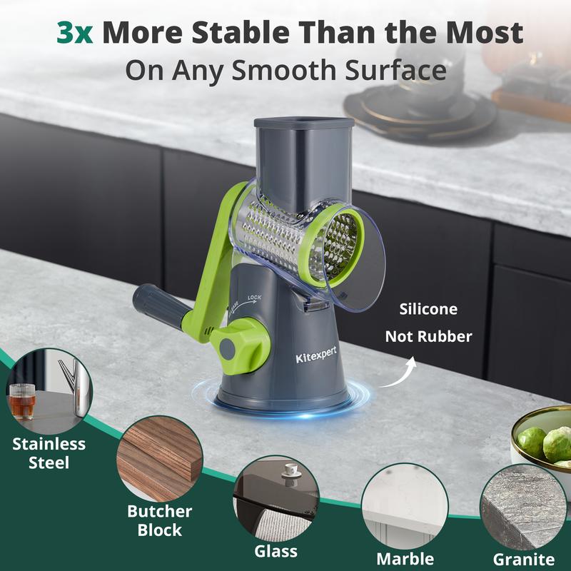 This grater is amazing, when it is locked in place it does not move at all and it took me no time to shred my cheese. The best purchase I ever made.