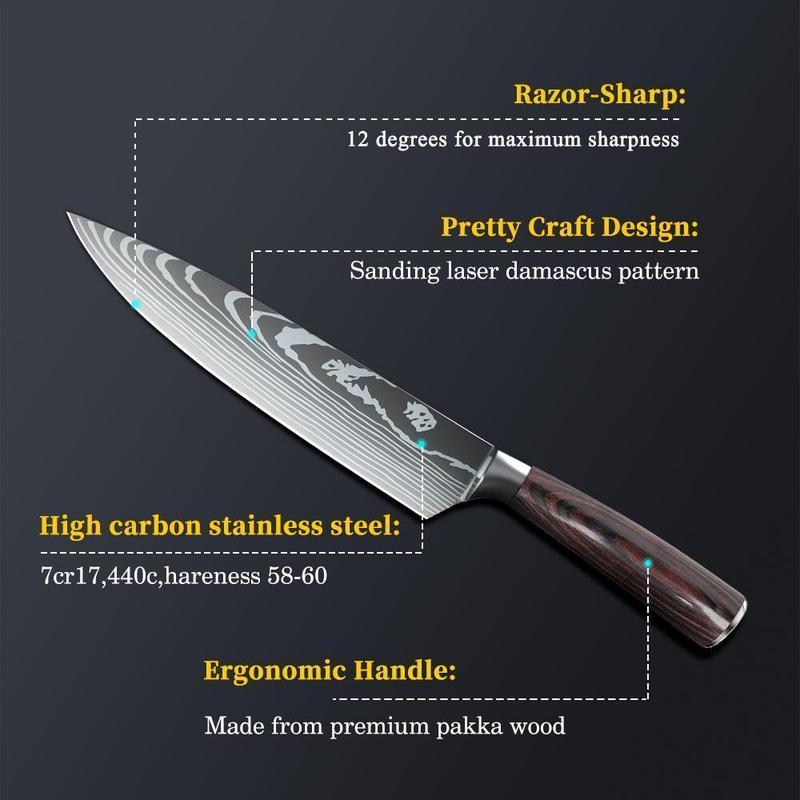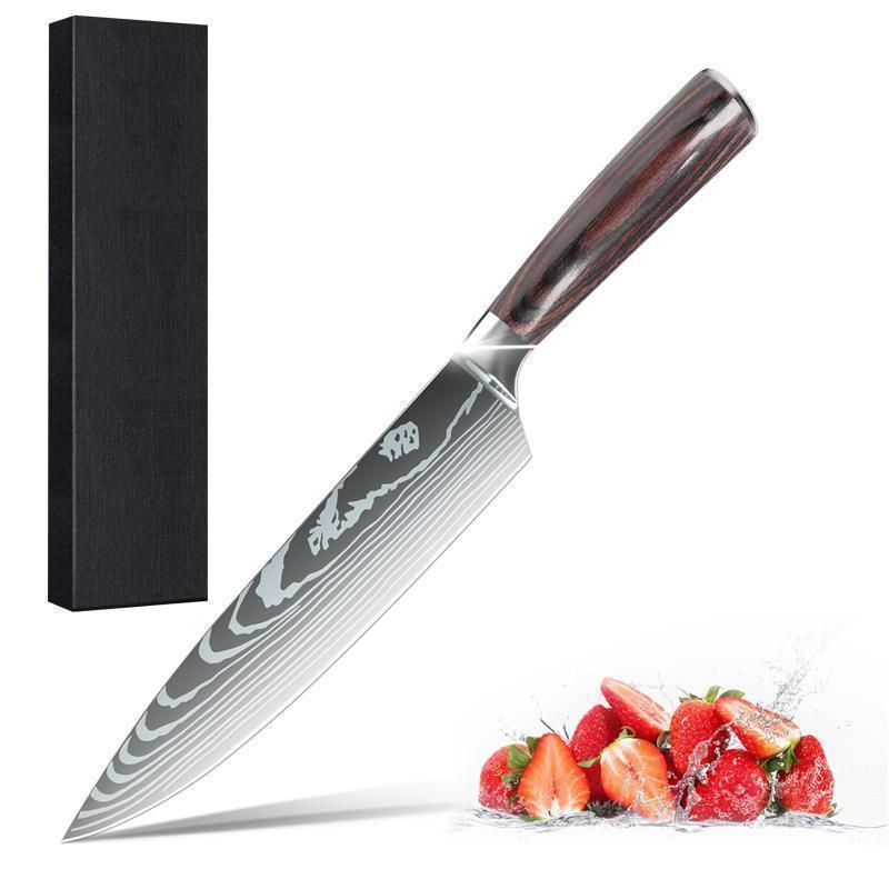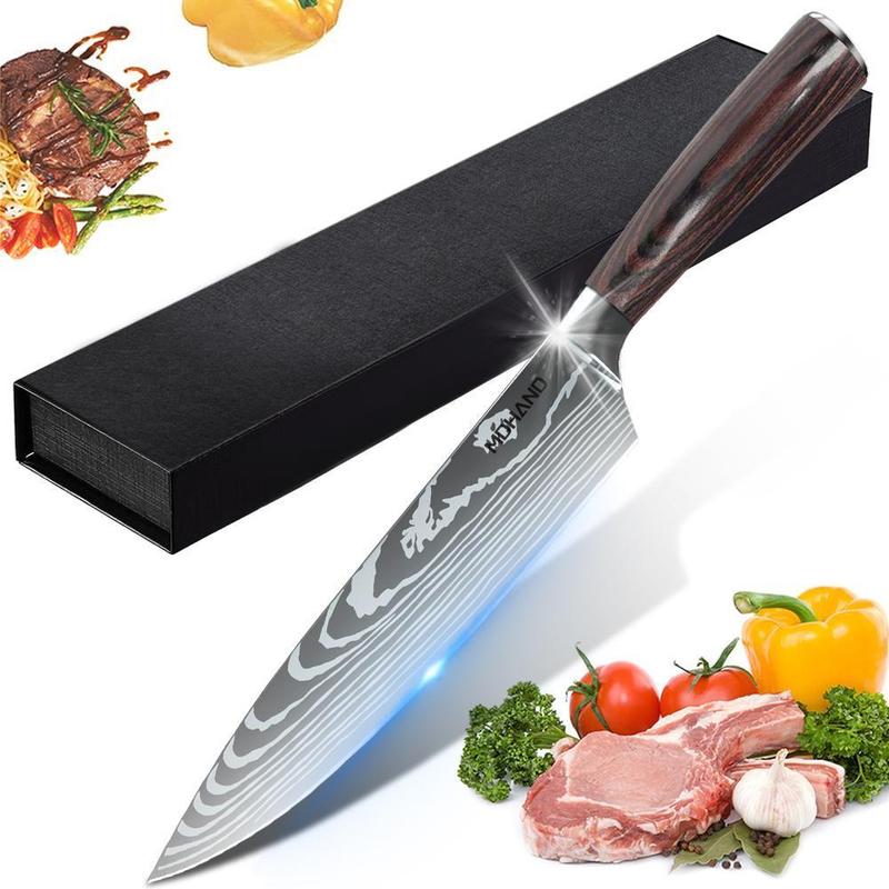 The blade is 7CR17 stainless steel, the surface of the laser Damascus pattern, very beautiful, good workmanship, razor sharp, keep your kitchen away from the blunt knife, and enjoy your kitchen life!