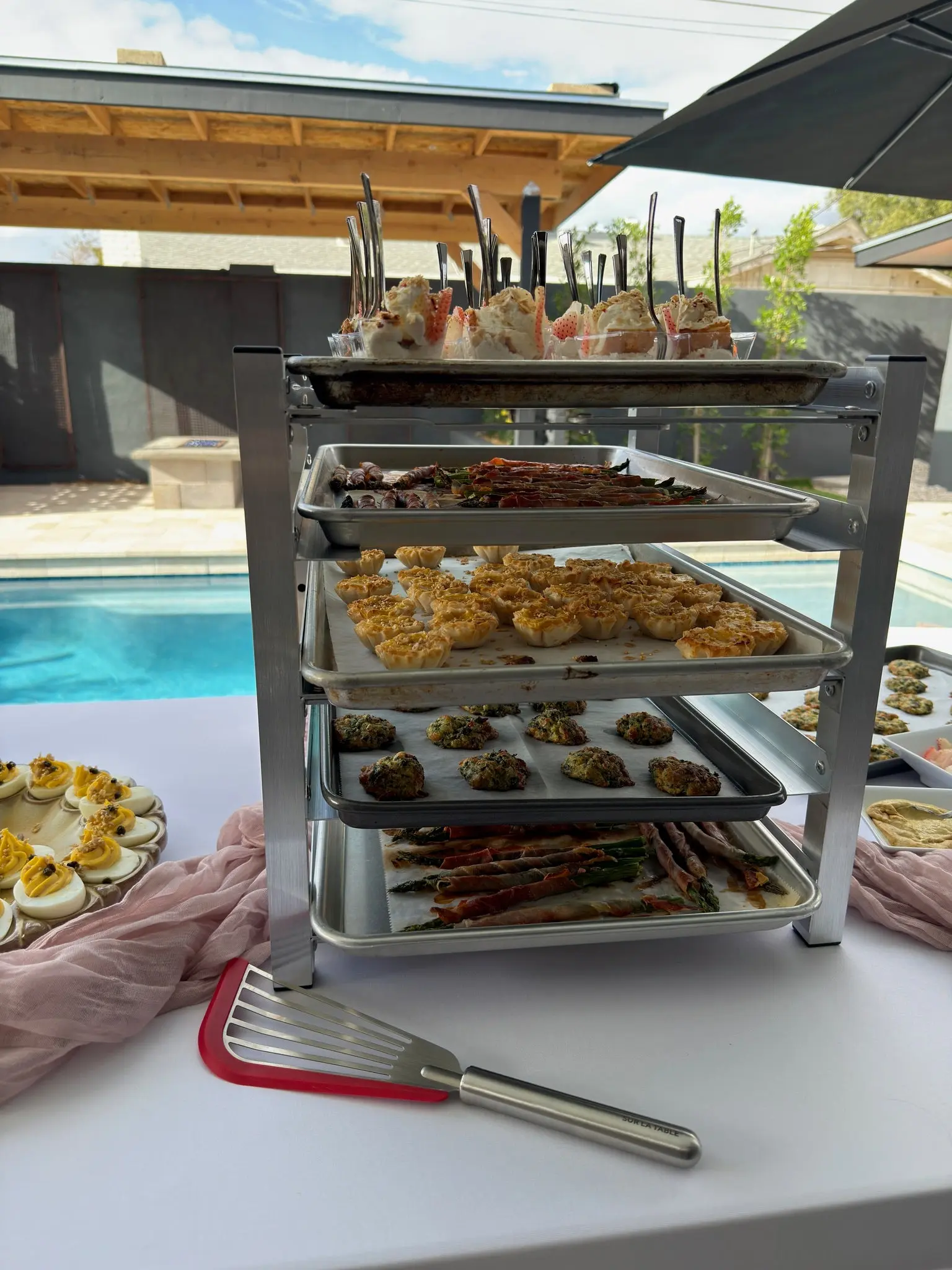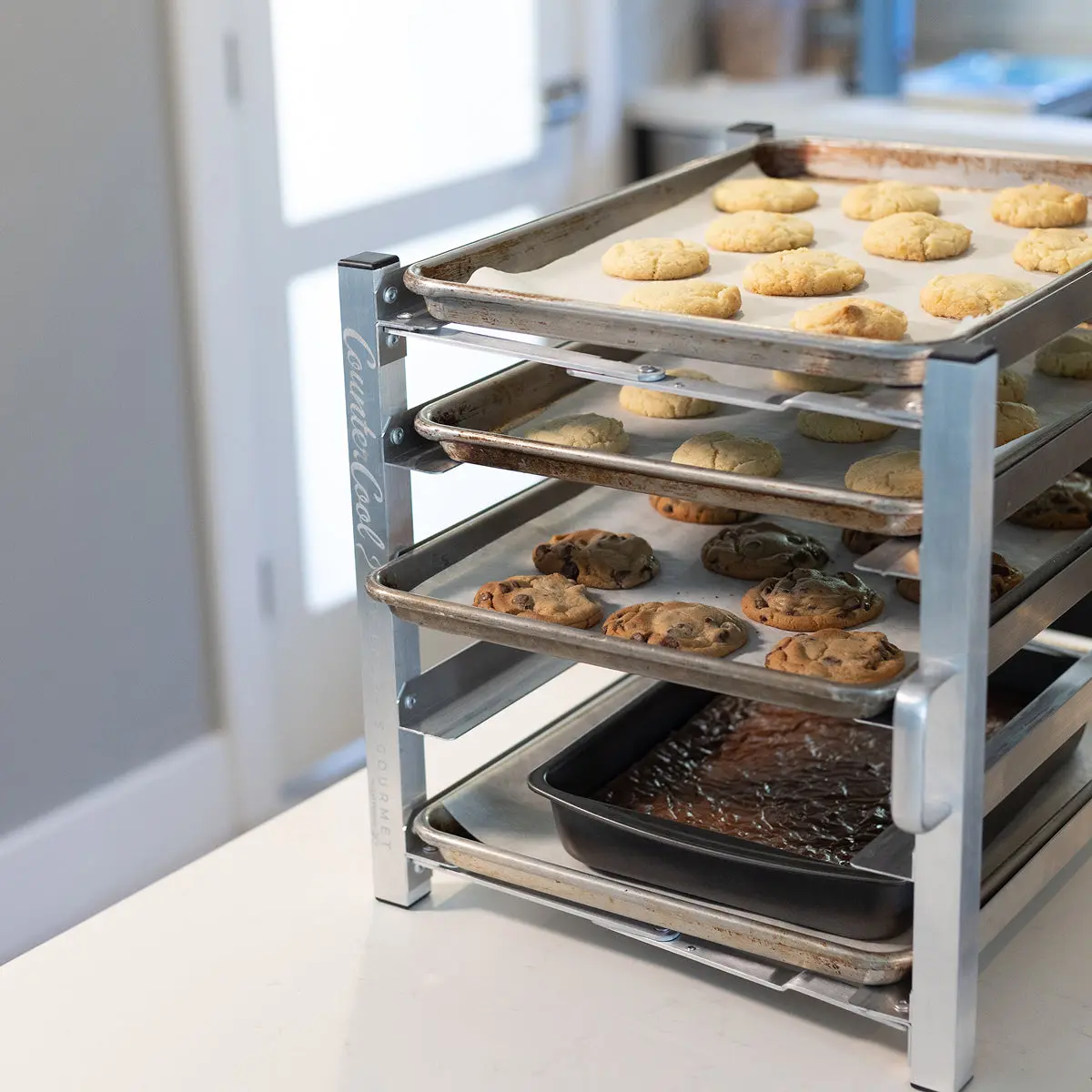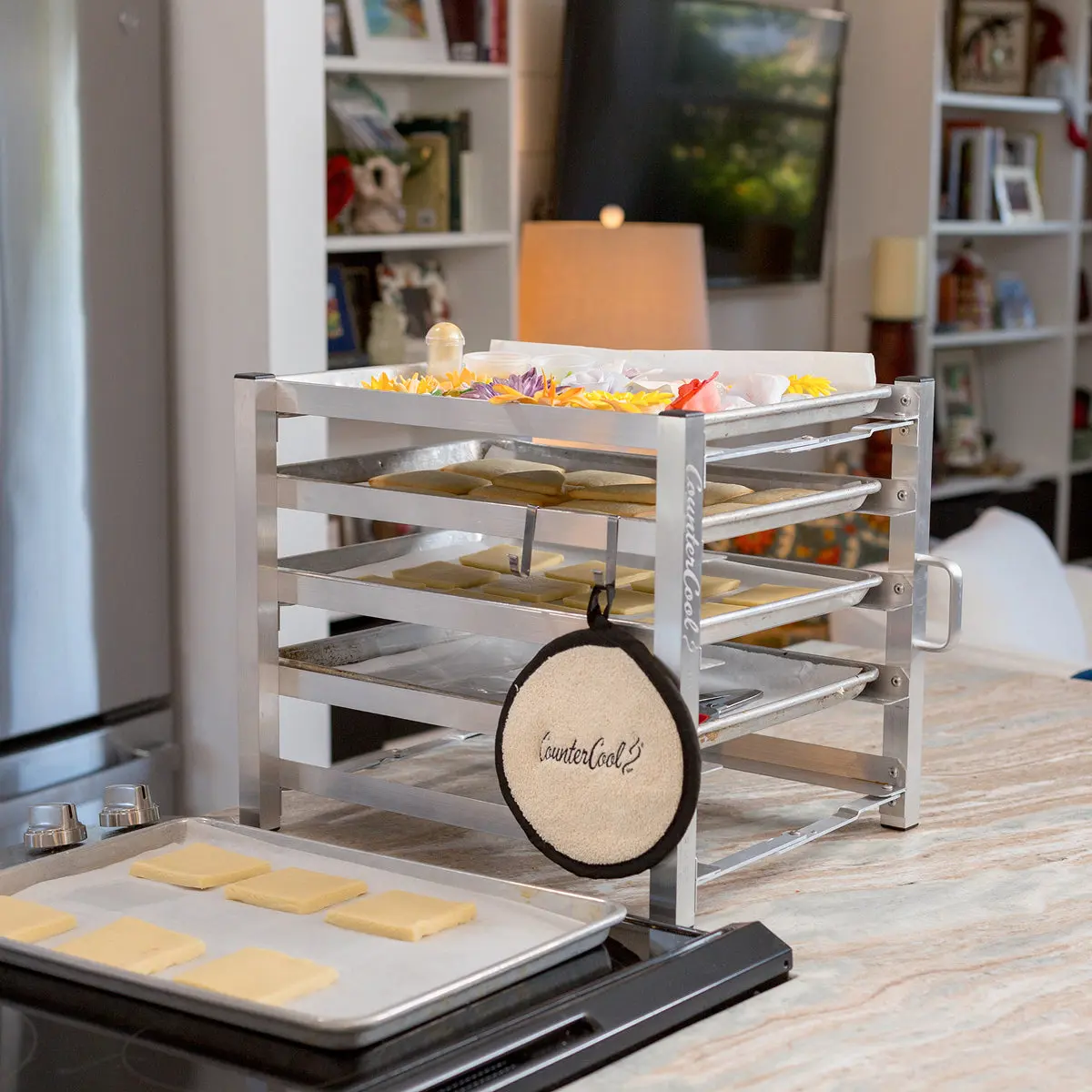 CounterCool® is the first countertop baking tray organizer that you can easily open and close whenever and wherever you need it. Weighing under five pounds, CounterCool can support over 40 pounds on food across five standard half sheet trays.
