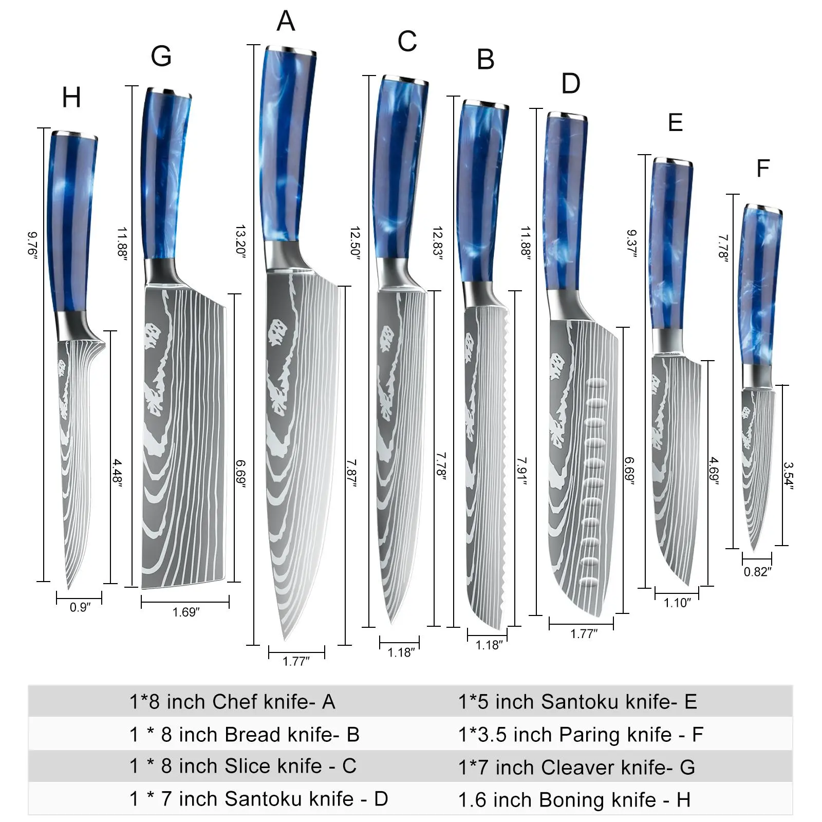 Tips: The blade is 7CR17 stainless steel, the surface of the laser Damascus pattern, very beautiful, good workmanship, razor sharp, keep your kitchen away from the blunt knife, and enjoy your kitchen life!