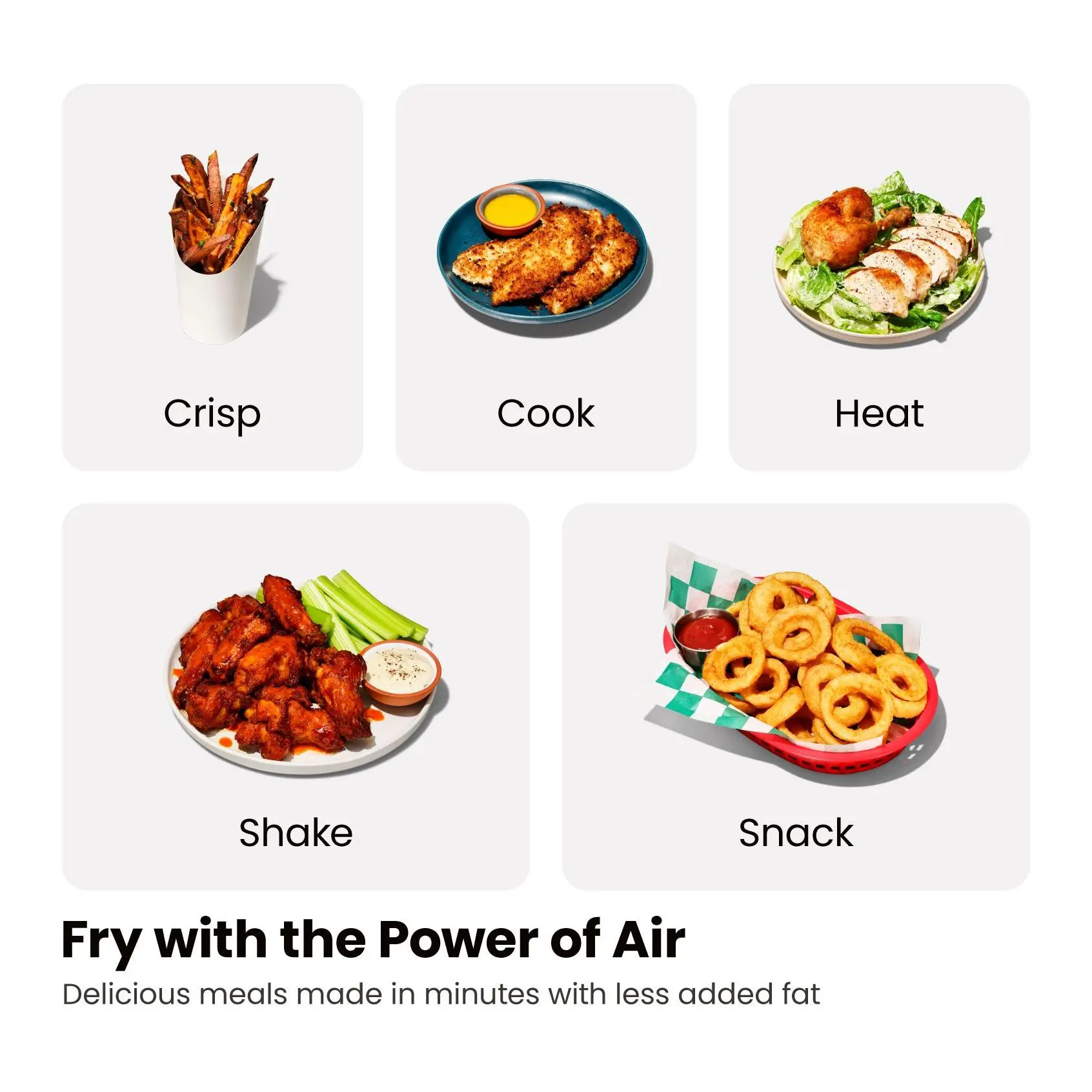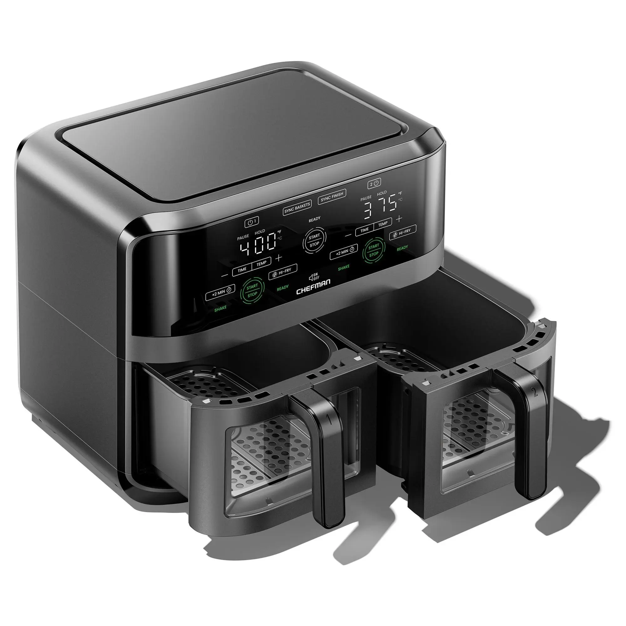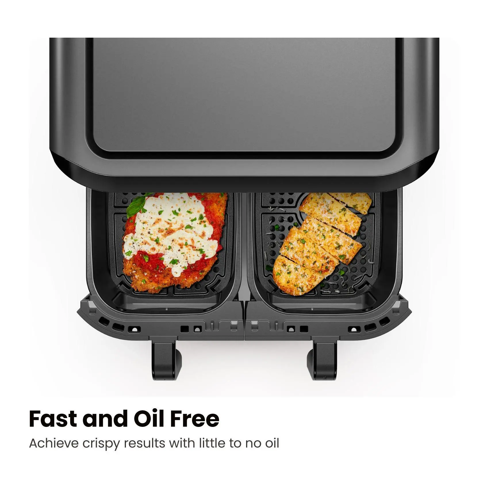 ·Dual 3-qt baskets allow cooking two foods at once