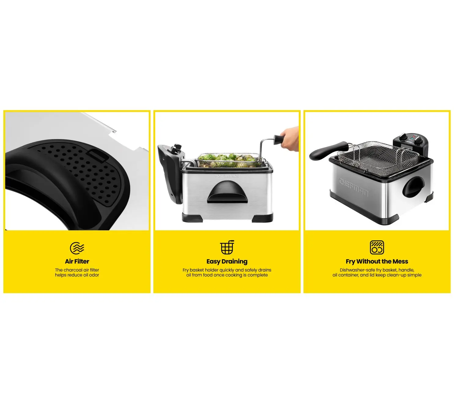 Dish up perfect golden fried treats every time with this efficient deep fryer boasting a removable lid with a window for easy monitoring. From Chefman.